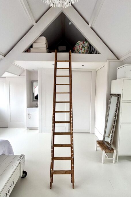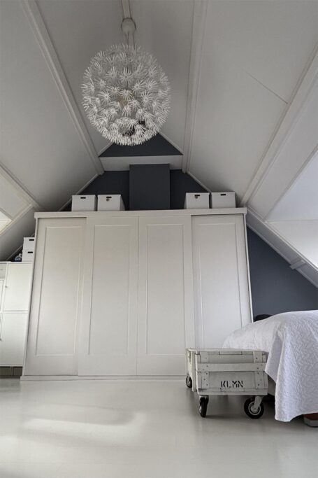 De vliering is bij de bovenverdieping betrokken tot aan de nok. In combinatie met de brede dakkapellen ontstaat hier een bijzonder lichte en rustige slaapkamer met veel ruimte en comfort.