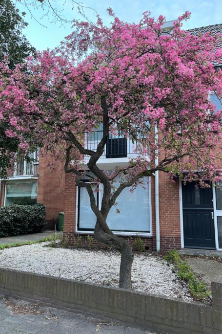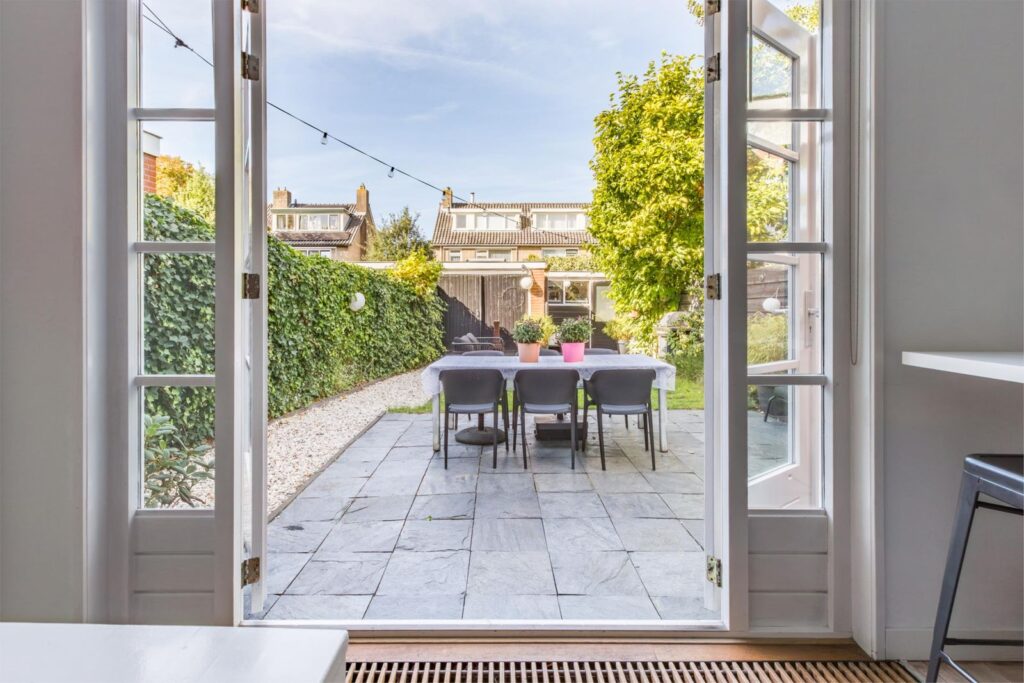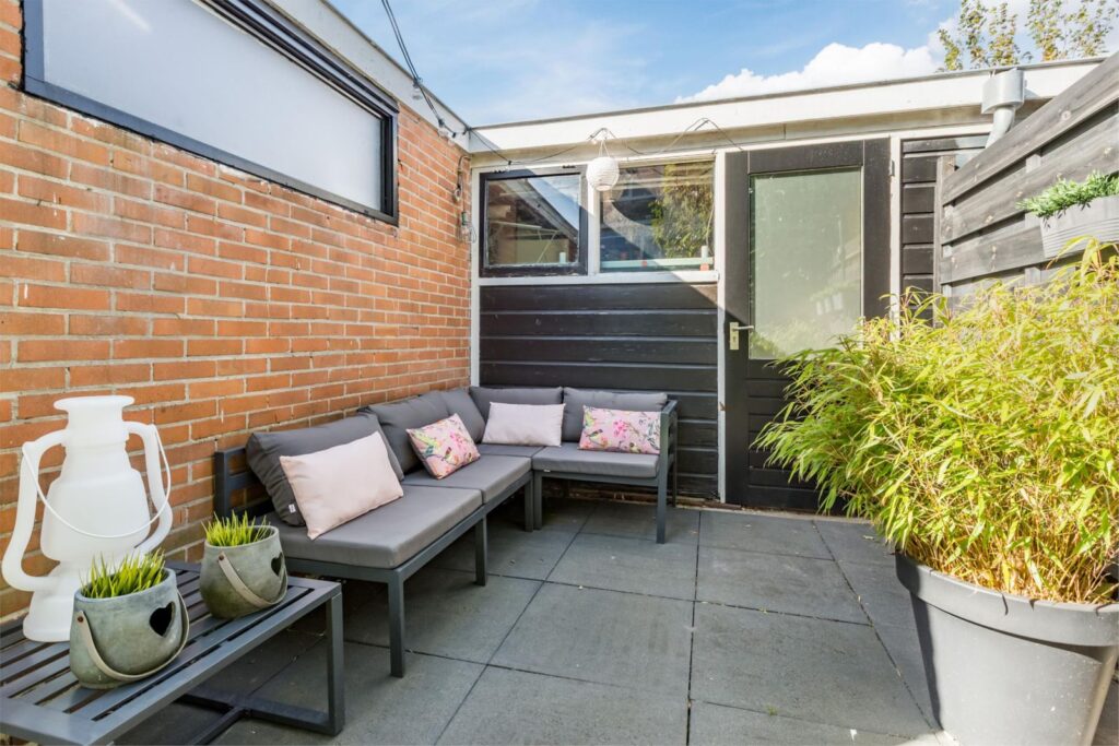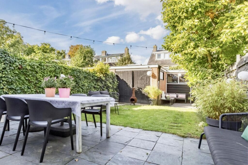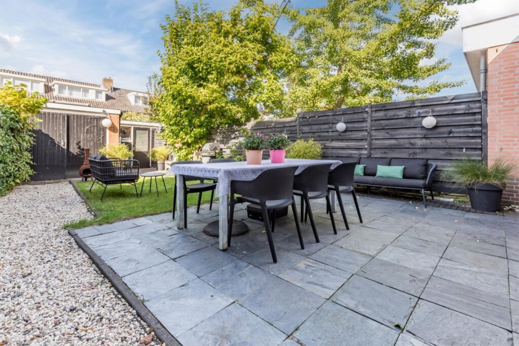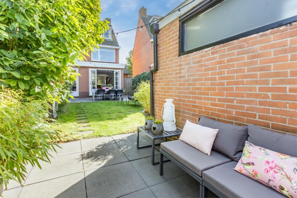 Via de zijkant van het huis bereik je eenvoudig de achtertuin, ook met (motor)fiets. De extra ruimte achter de woning – ontstaan door uitbreiding van het perceel en het betrekken van het garagepad bij de tuin – maakt deze tuin echt bijzonder.