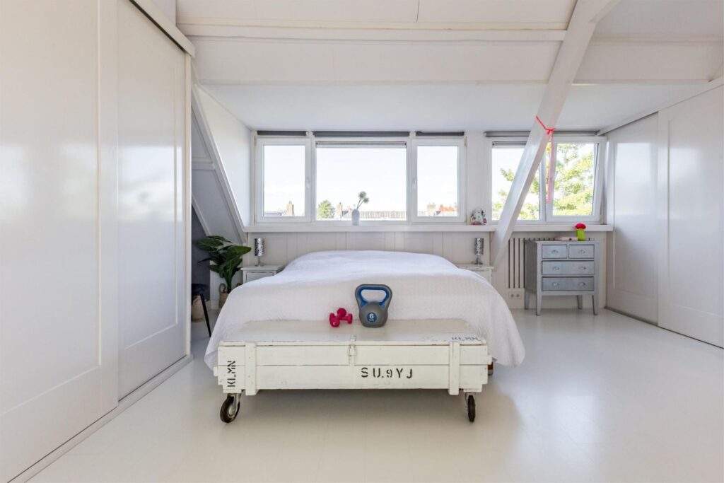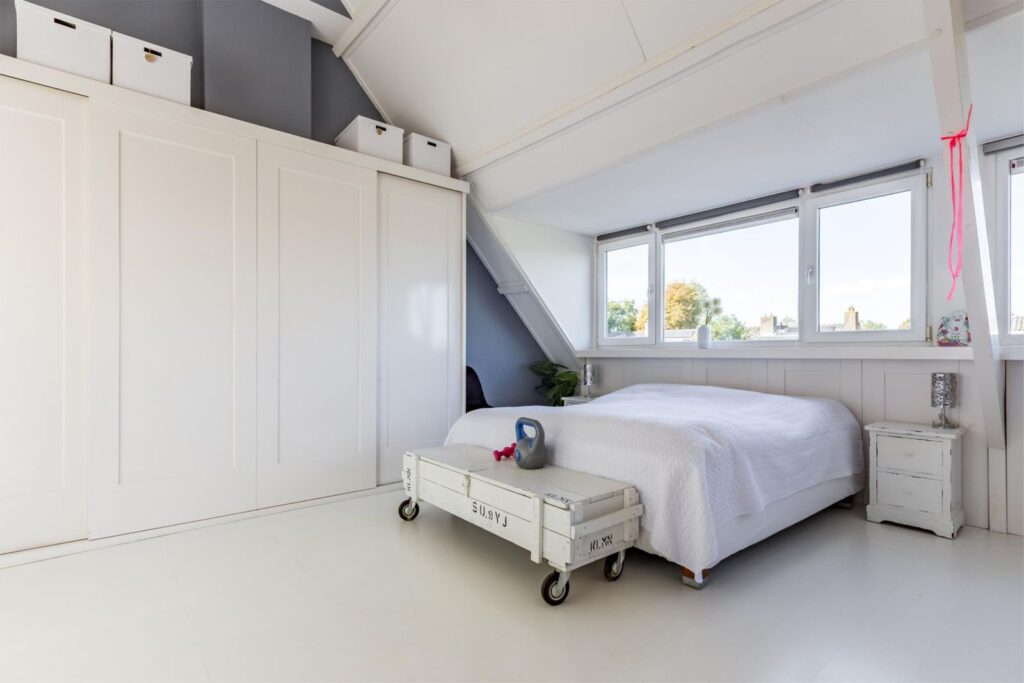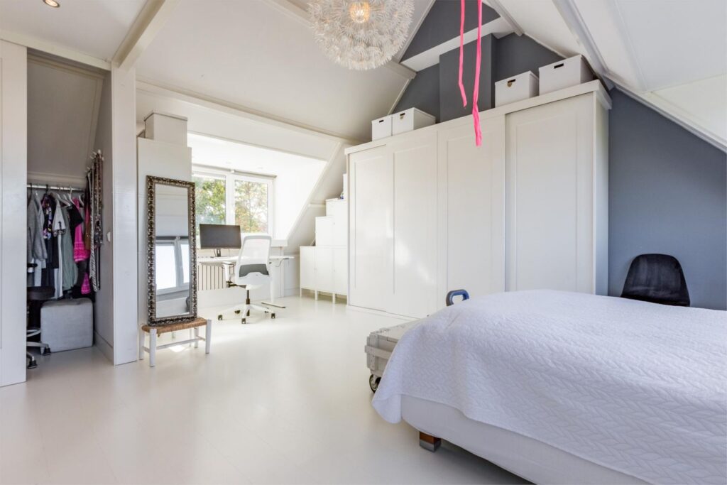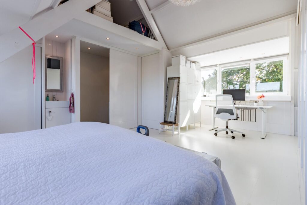 De zolderverdieping is verrassend ruim dankzij twee brede dakkapellen. Hier vind je een lichte master bedroom met wastafel en een mooi uitzicht op het groen en de achtertuin.