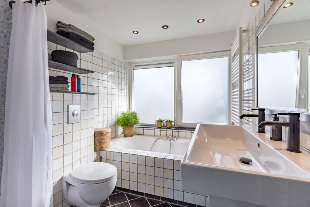 Complete badkamer met bad, douche, dubbele wastafel, toilet en vloerverwarming