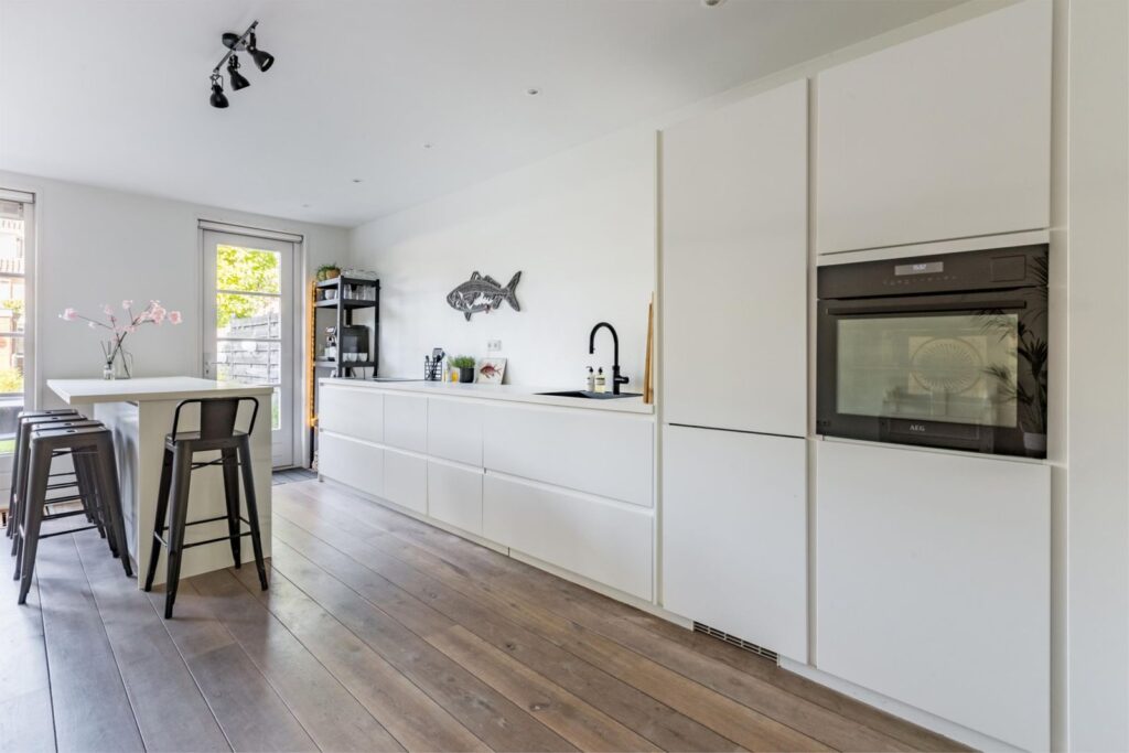 De moderne open keuken met kookeiland is een echte blikvanger en voorzien van hoogwaardige AEG-inbouwapparatuur, een inductiekookplaat (3-fase), Quooker Flex, combi-stoomoven en veel werk- en opbergruimte. Een heerlijke plek om te koken, te borrelen en samen te zijn.
