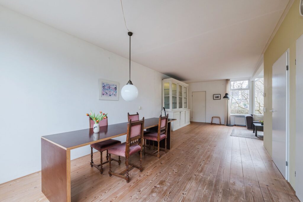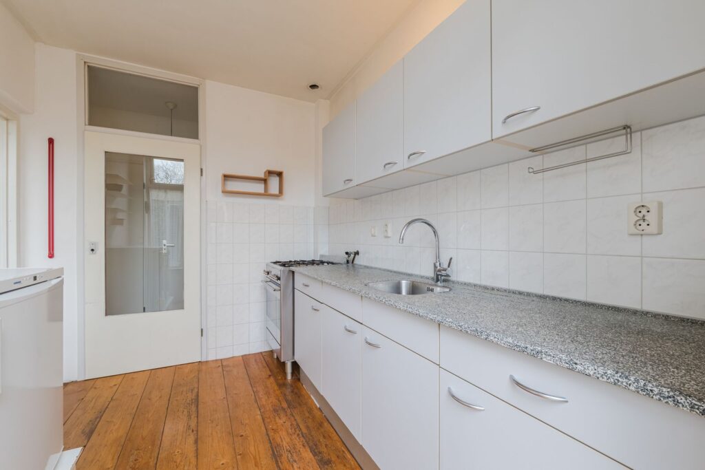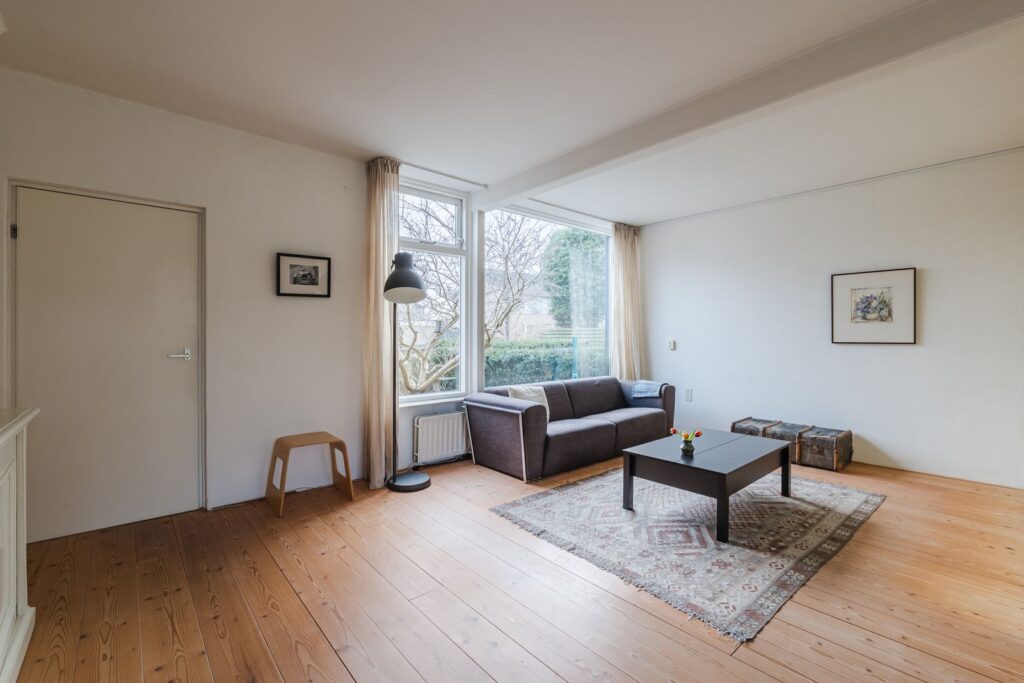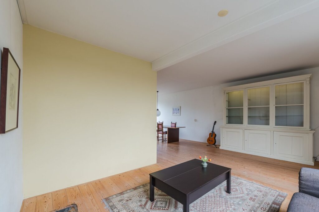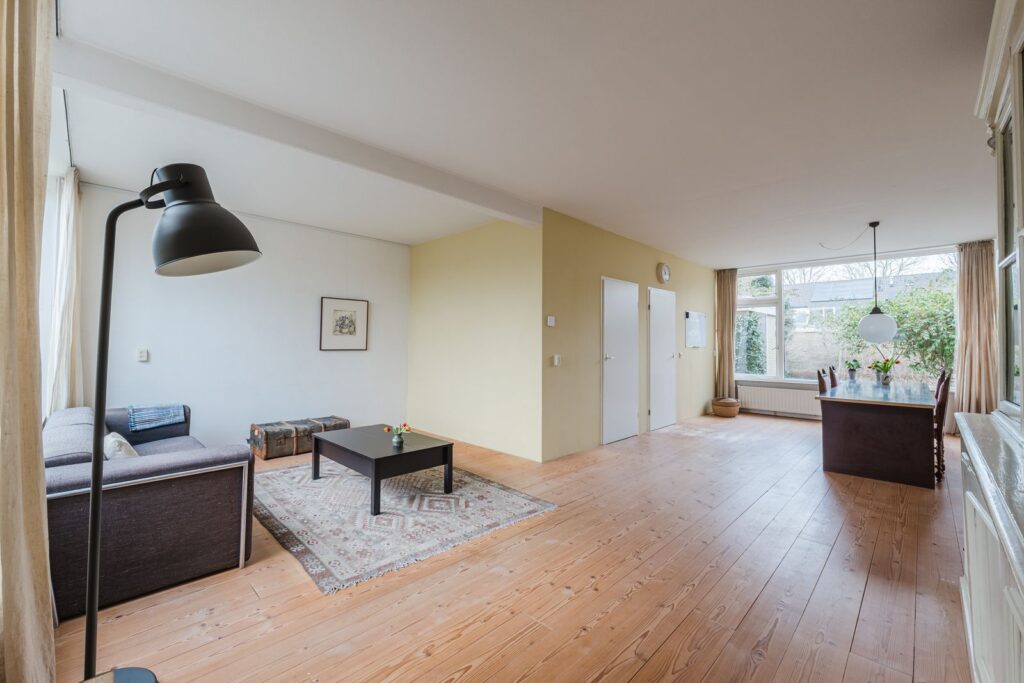 Portaal met meterkast en watermeter, ruime lichte L-vormige woonkamer met massief houten vloer (los gelegd), dichte eenvoudige keuken met tuindeur.