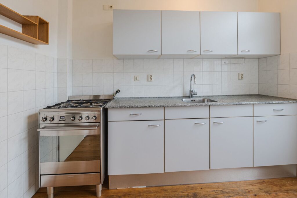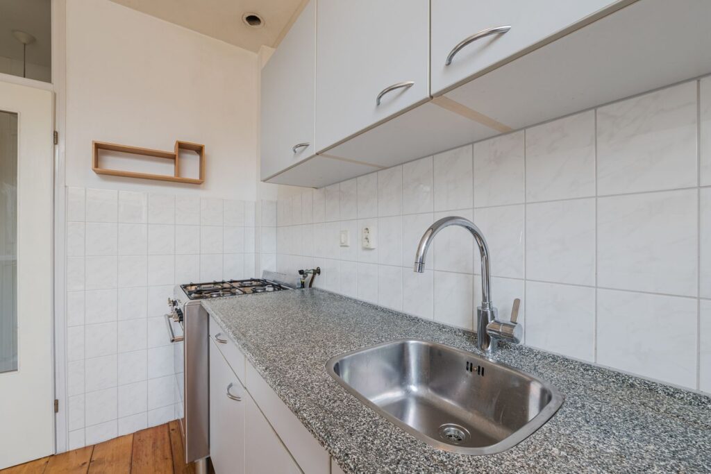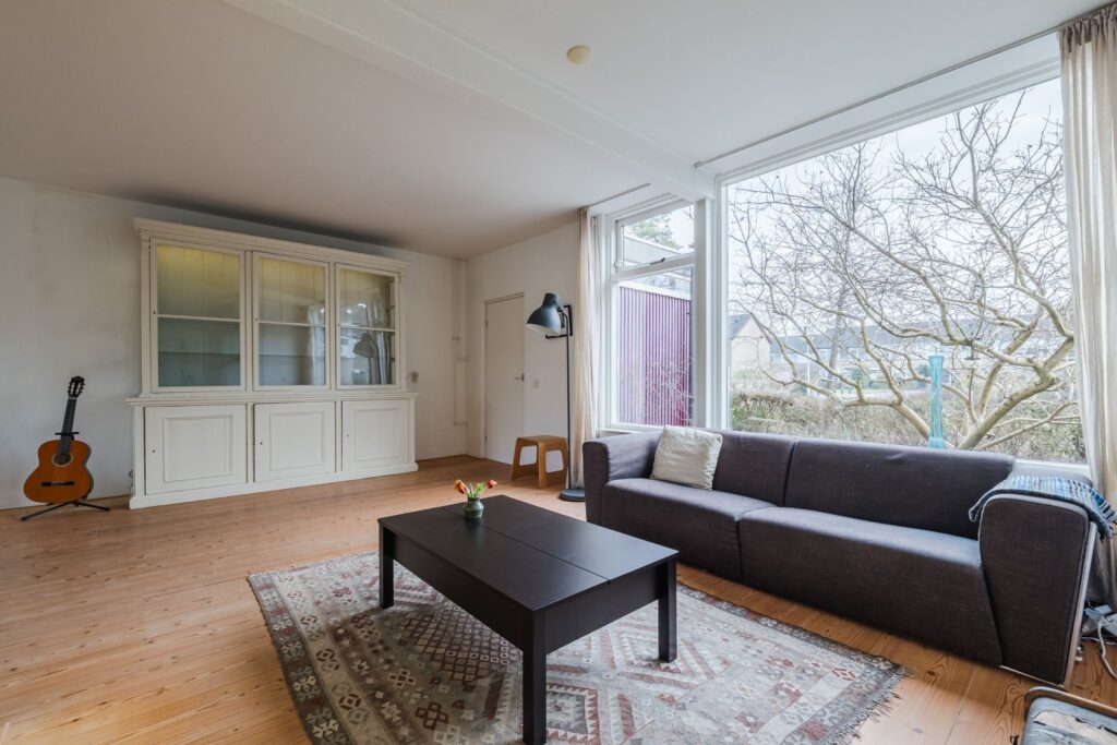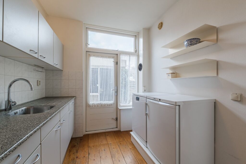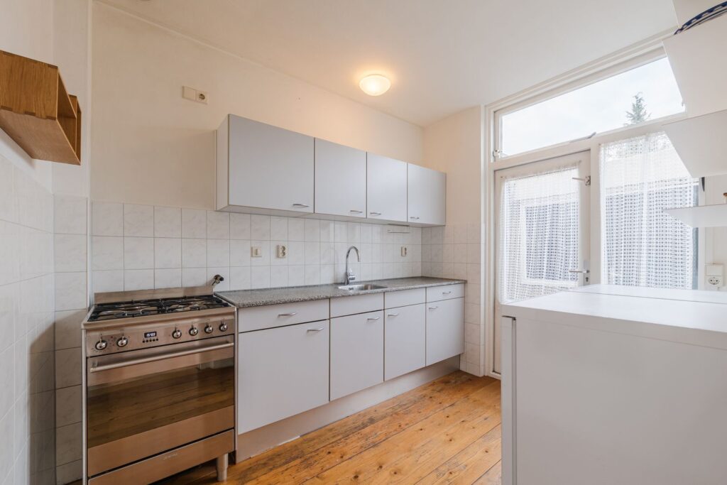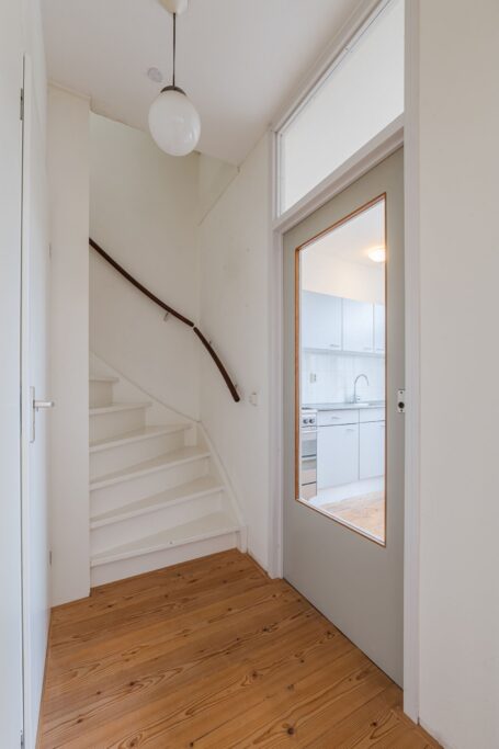 Portaal met meterkast en watermeter, ruime lichte L-vormige woonkamer met massief houten vloer (los gelegd), dichte eenvoudige keuken met tuindeur.