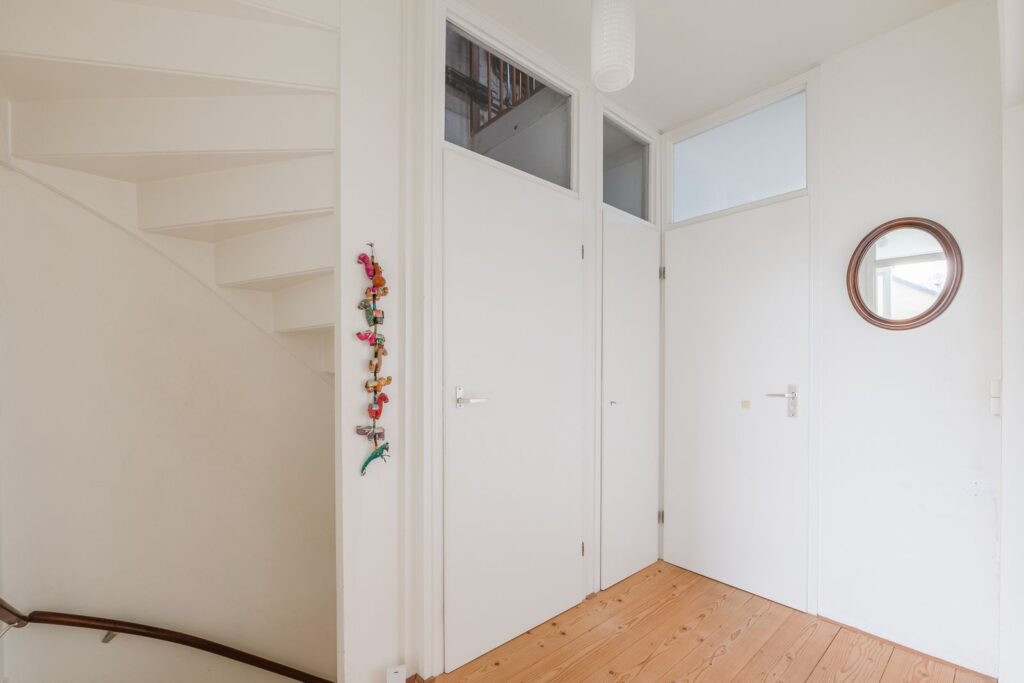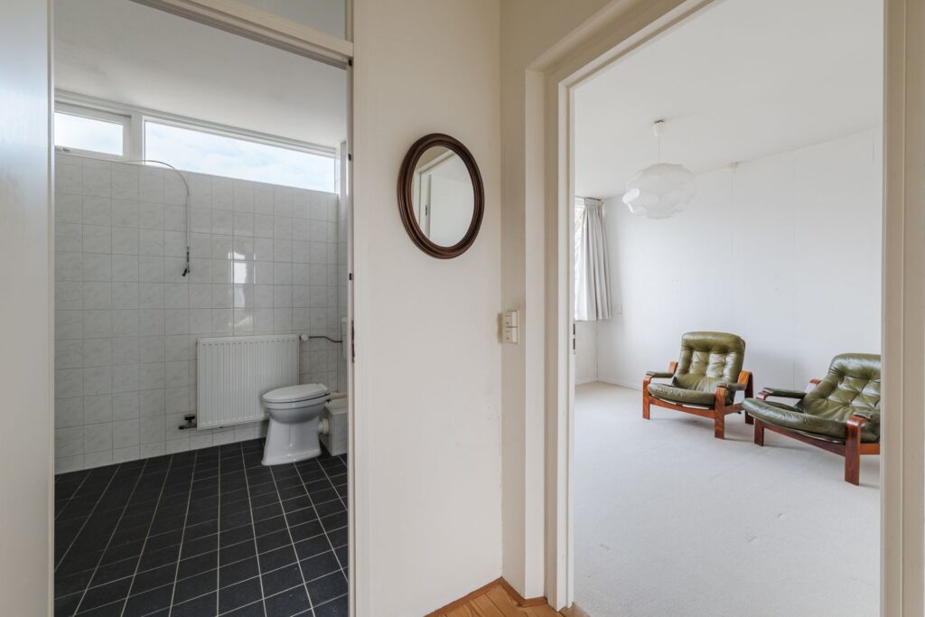 Tussenhal met bergkast, toilet voorzien fontein en de trapopgang naar de verdieping.