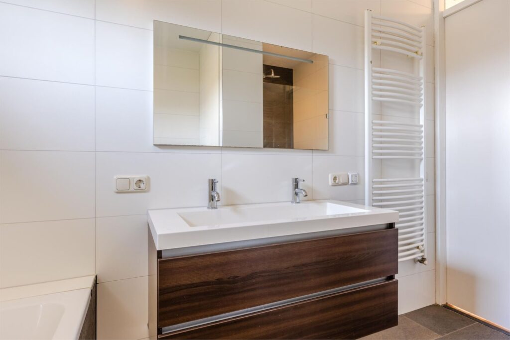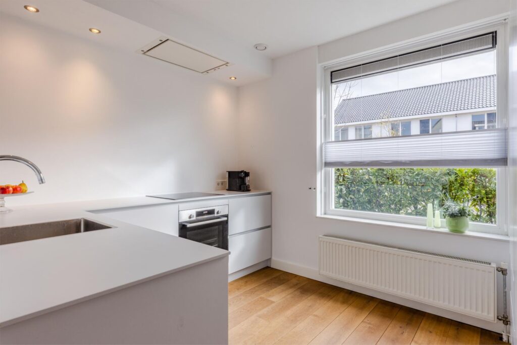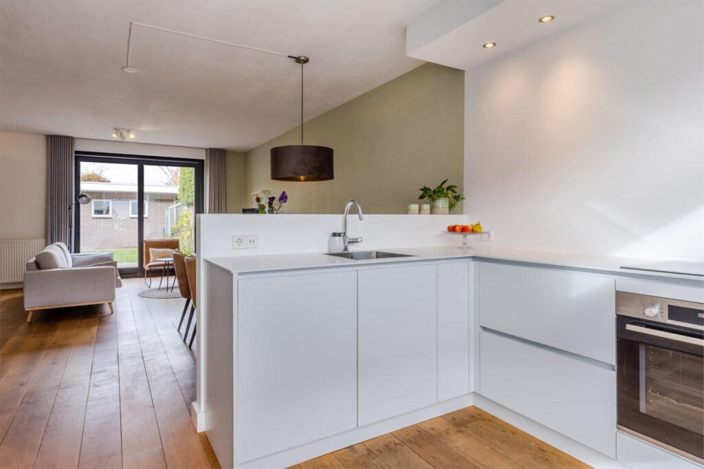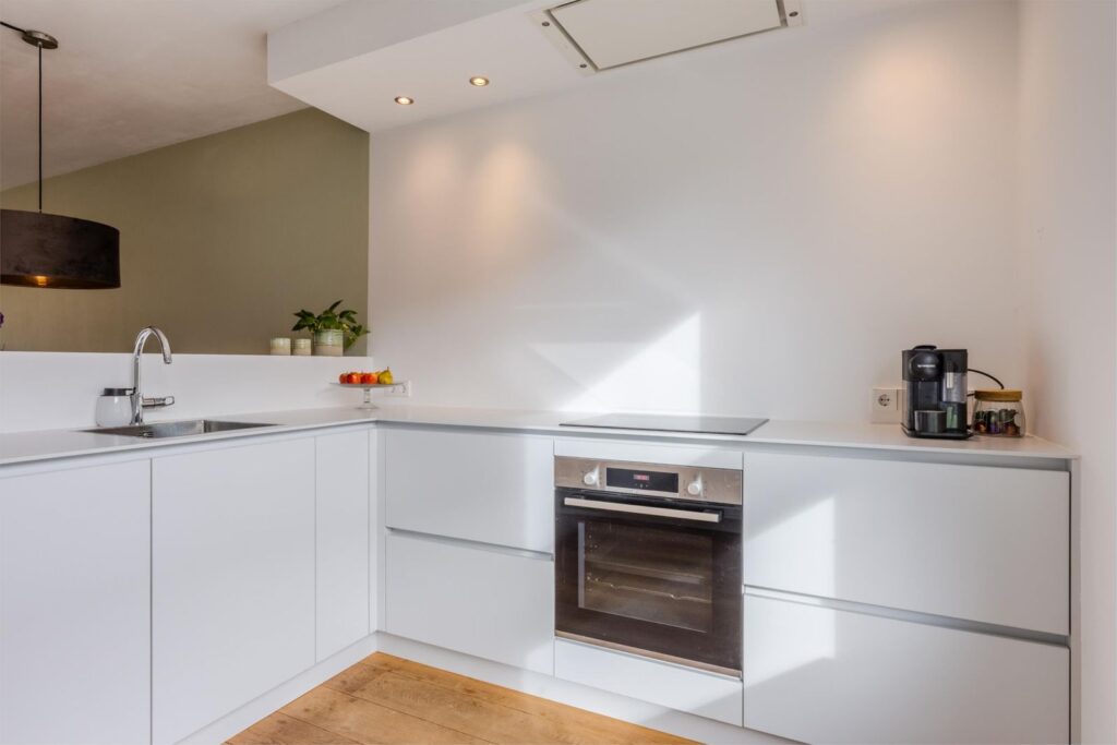 De moderne keuken, eveneens vernieuwd in 2020, is licht van kleur en praktisch ingedeeld. Er is een inductiekookplaat, een afzuigkap op hoogte en voldoende opbergruimte zonder bovenkastjes, waardoor de ruimte open en overzichtelijk blijft.