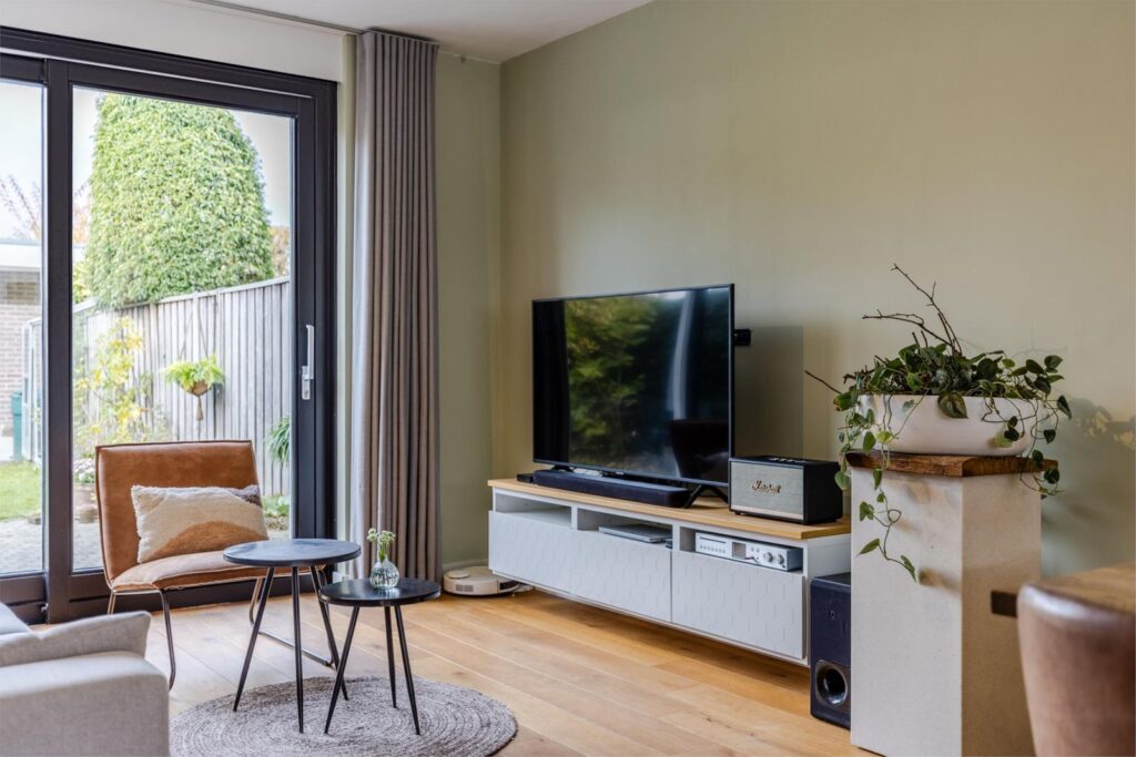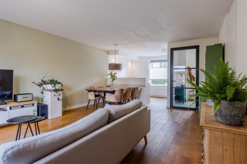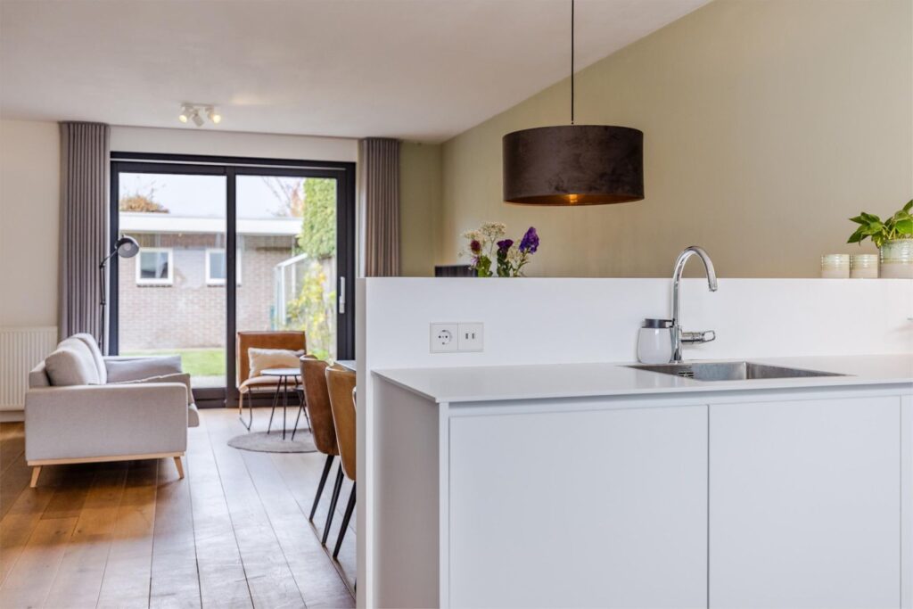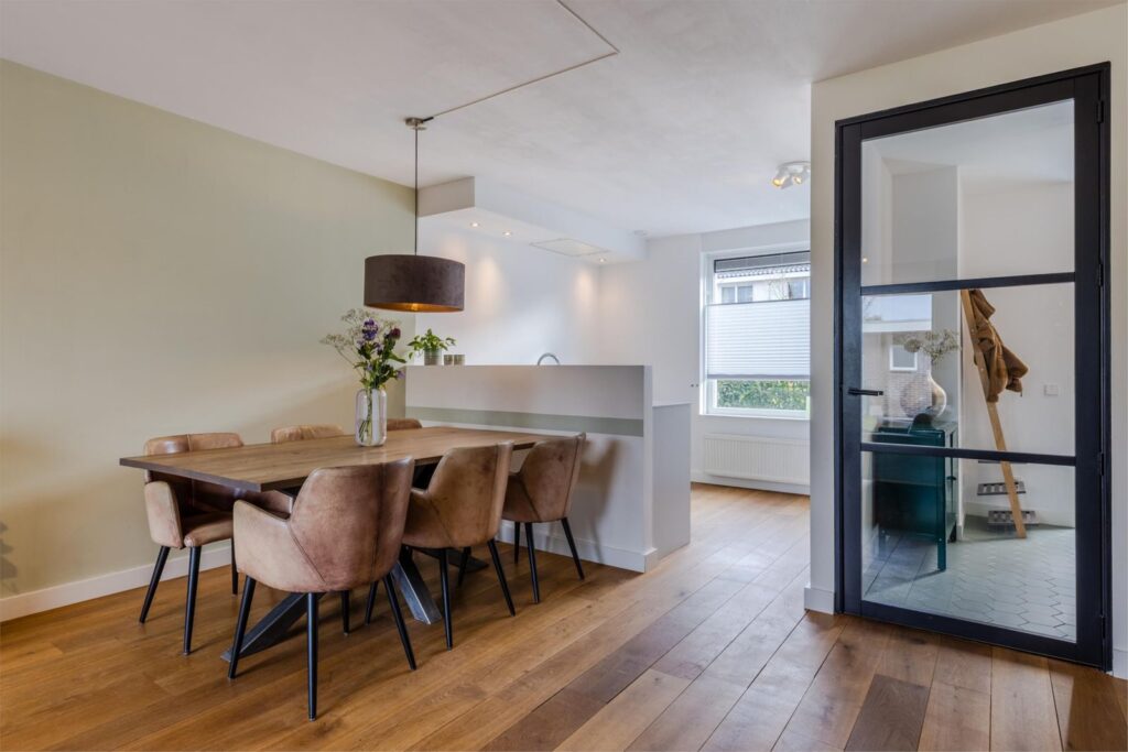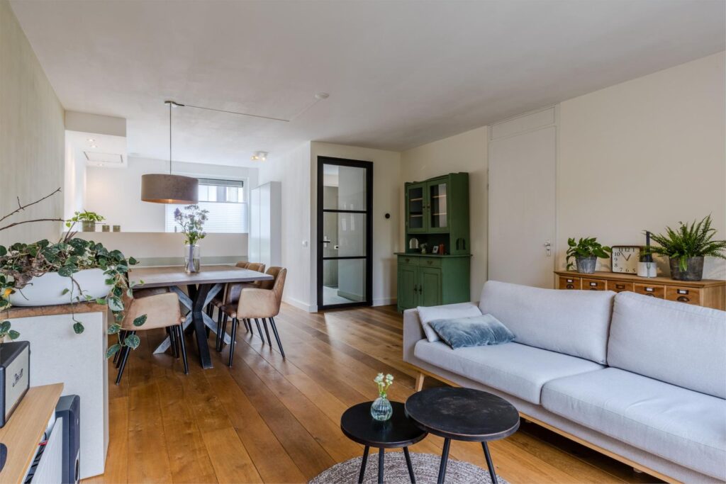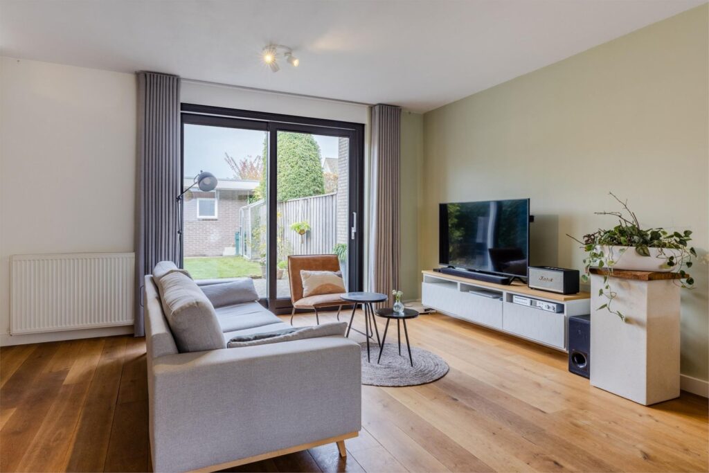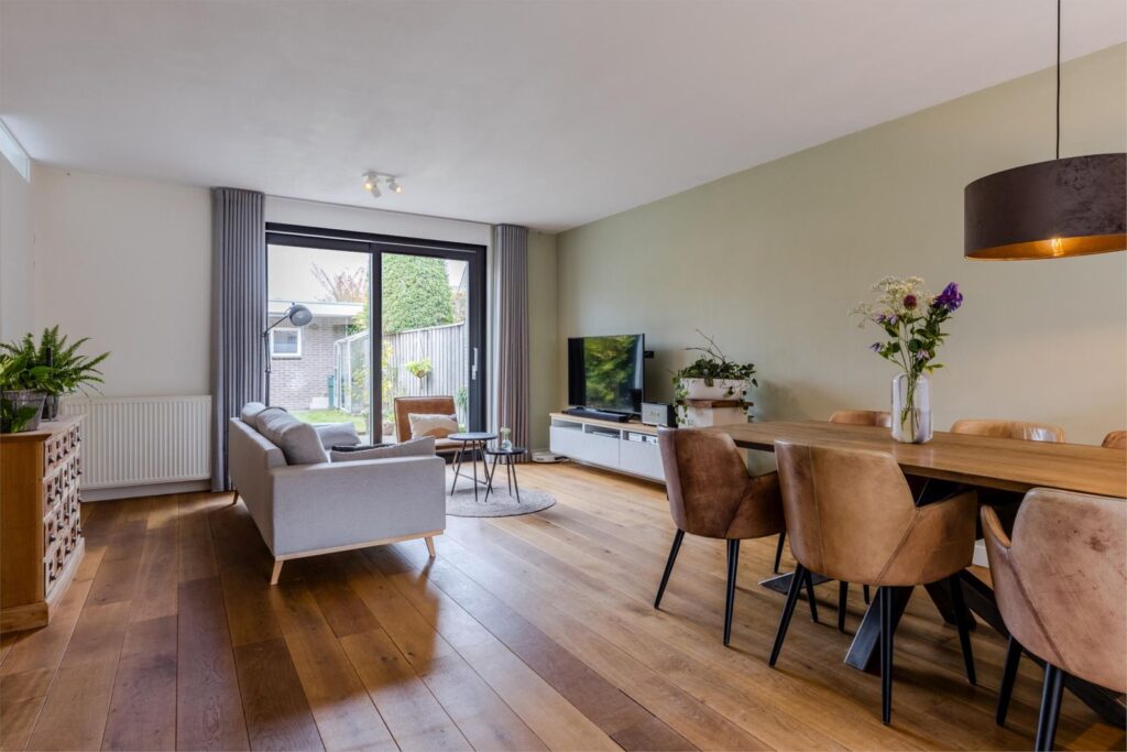 Via de vernieuwde hal (2020) kom je binnen in de lichte woonkamer. Het grote raam aan de voorzijde bij de keuken en de schuifpui aan de achterzijde zorgen de hele dag voor veel natuurlijk licht. De eikenhouten vloer geeft de ruimte een warme uitstraling.