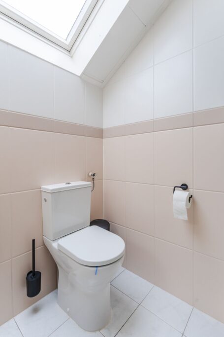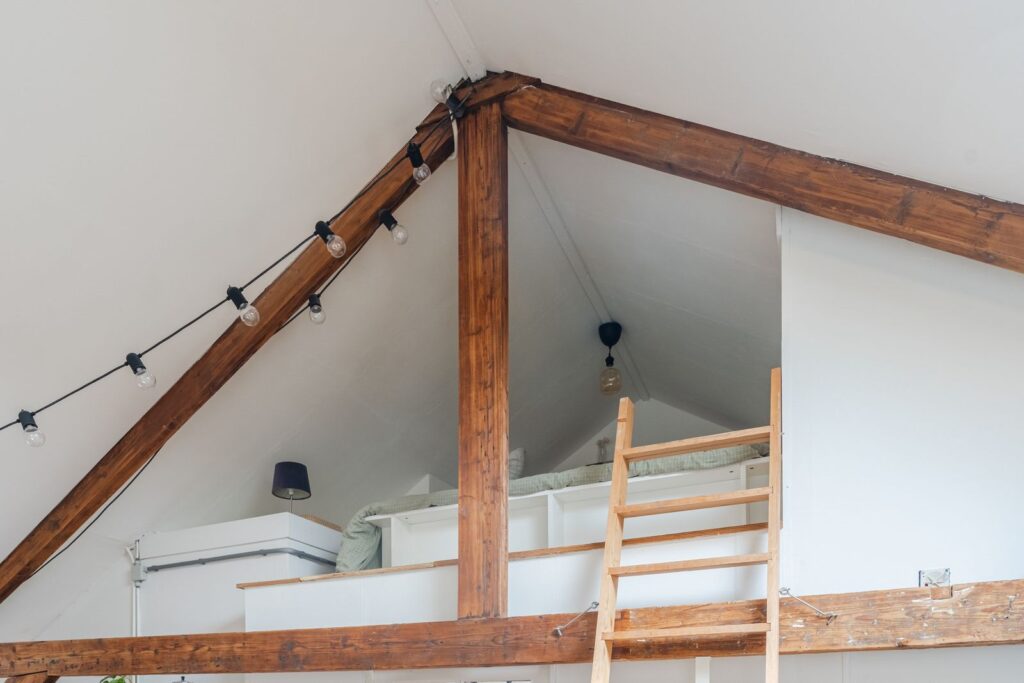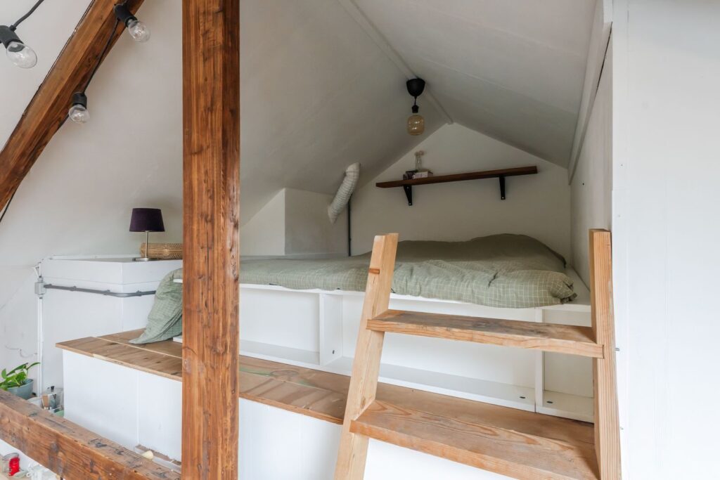Second floor: a very large multifunctional room with a beautiful wooden floor and mezzanine, including its own kitchenette. This space is extremely flexible and can be used as a bedroom, workspace, hobby room, guest accommodation, or even divided into multiple rooms. This floor also features the bathroom and an additional bedroom, both with skylights.