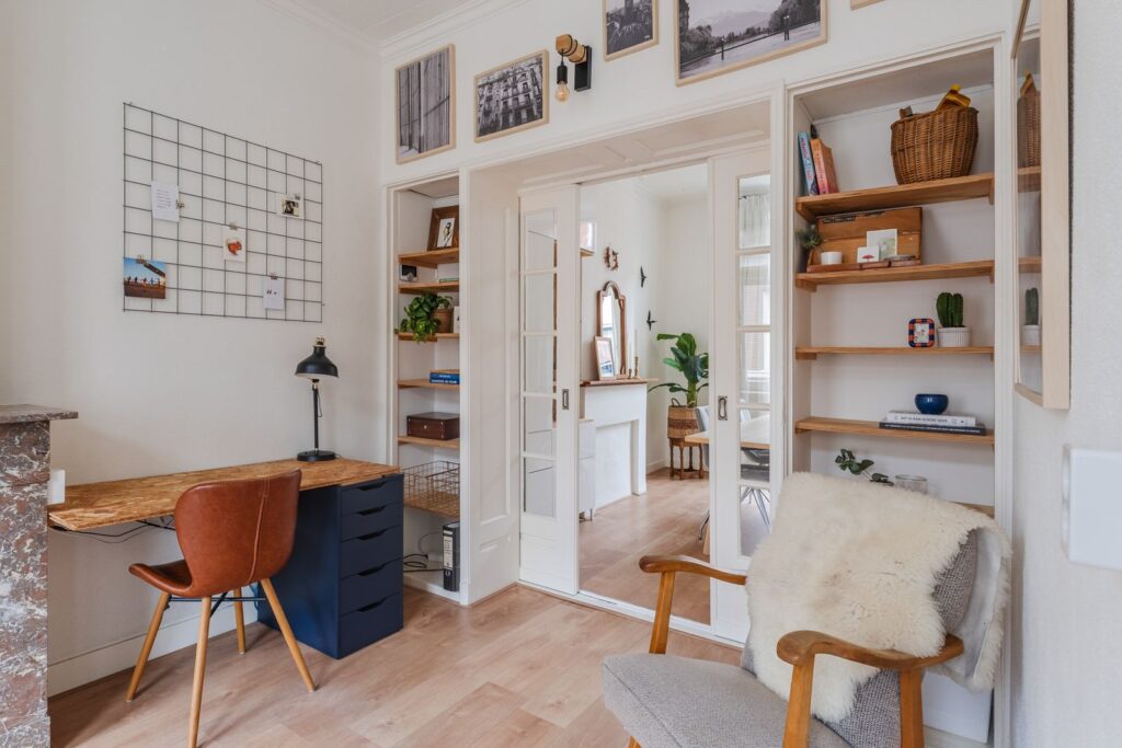 Eerste verdieping: lichte woonkamer en eetkamer, gescheiden door ensuite deuren, een keuken (2019 vernieuwd), een slaapkamer/werkkamer en een losse wc.
