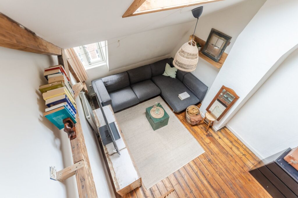 Het Franse balkon, de hoge plafonds en meerdere dakramen zorgen voor een ruimtelijk gevoel en veel natuurlijk licht.