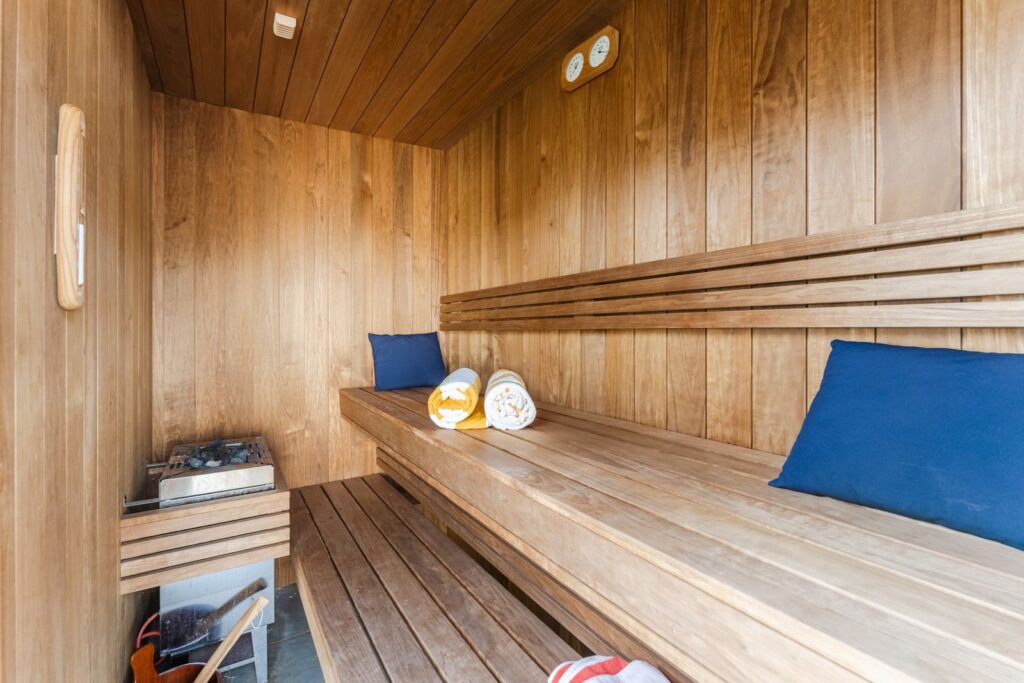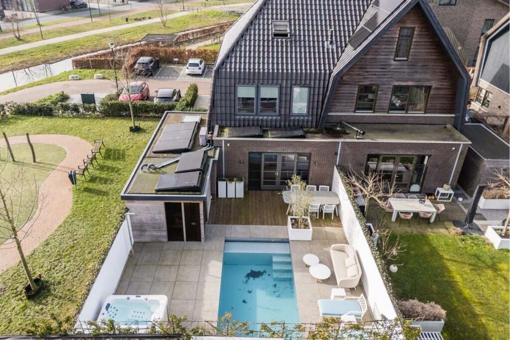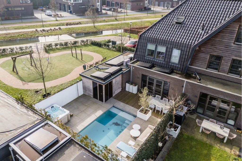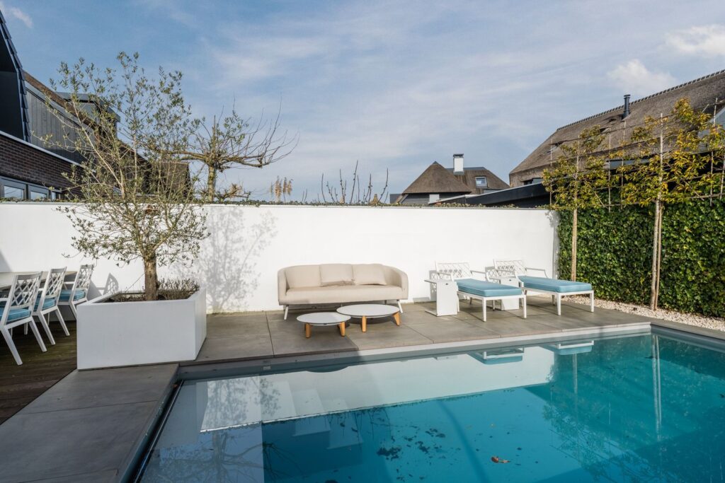 Via de openslaande deuren loopt u zo de fraai aangelegde tuin in, waar ontspanning en comfort centraal staan. Hier vindt u een zwembad dat veilig is voor kleine kinderen die nog niet kunnen zwemmen, evenals een jacuzzi en sauna. Een perfecte setting om in alle rust te ontspannen of juist te genieten met familie en vrienden.