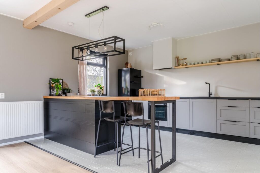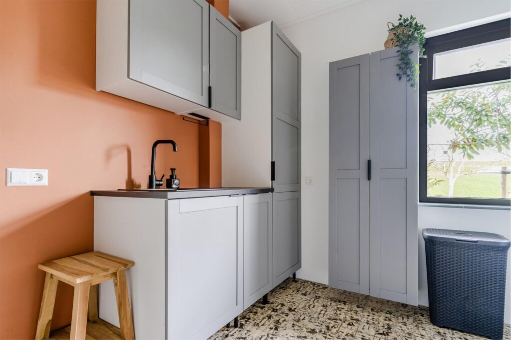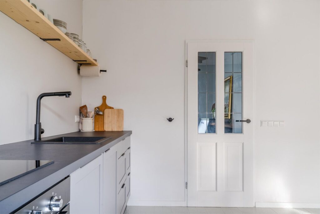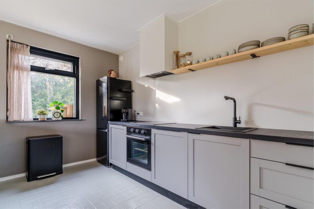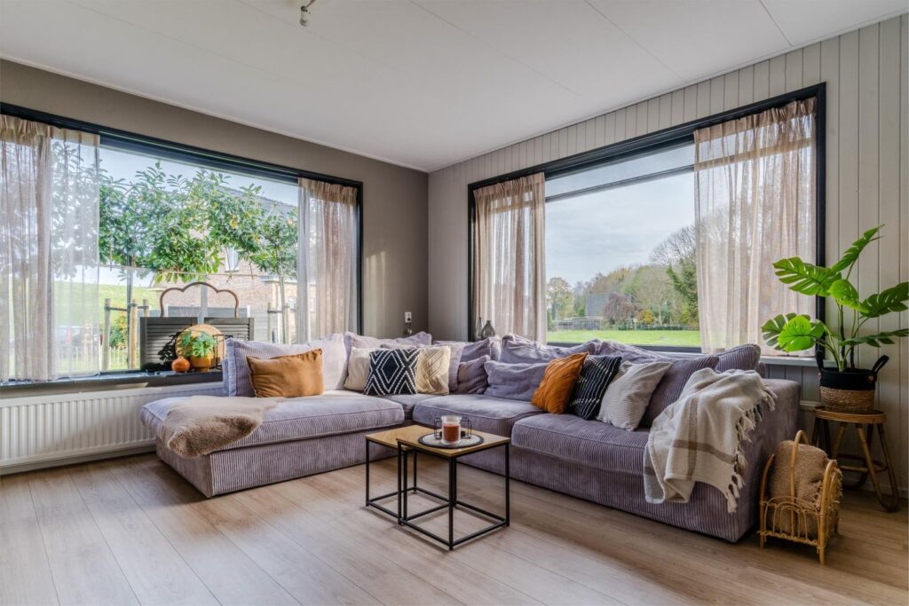 Binnen is het licht, sfeervol en comfortabel. De woonkamer met openslaande deuren naar de overkapping vormt samen met de open keuken met bar het hart van het huis. Hier leef je, kook je en geniet je, met de tuin altijd dichtbij via de openslaande deuren naar het terras.