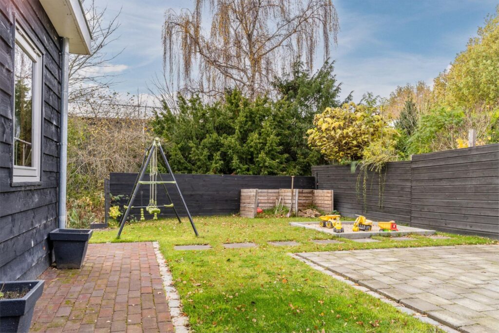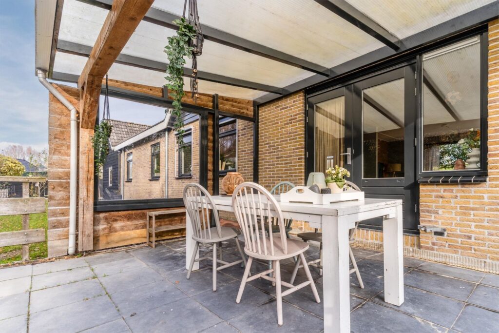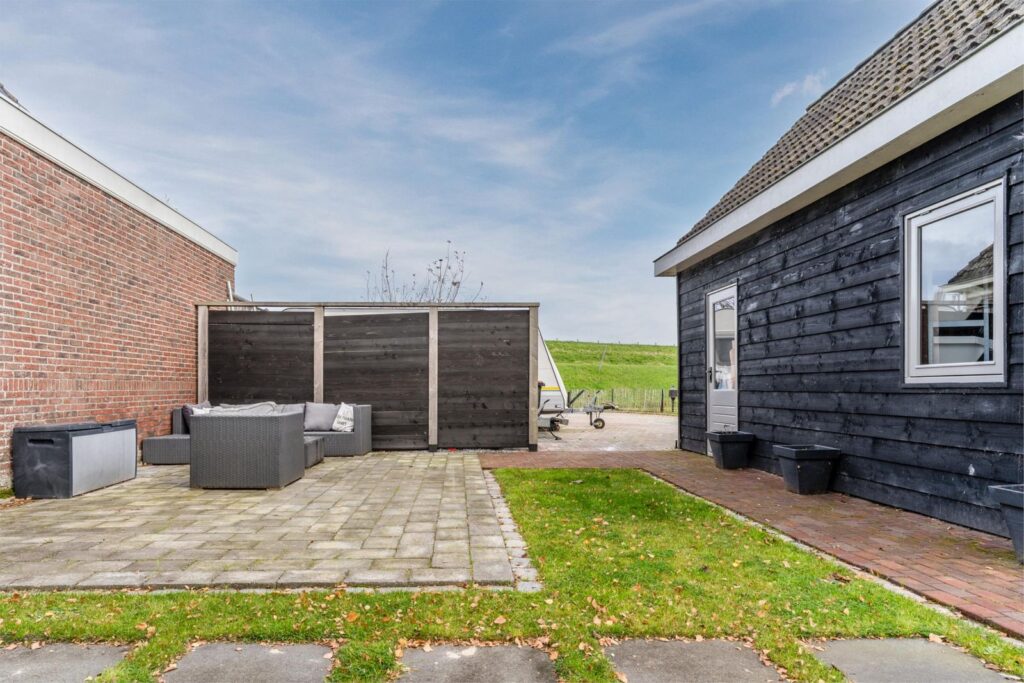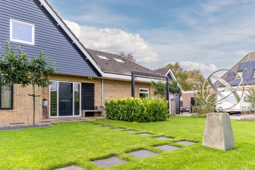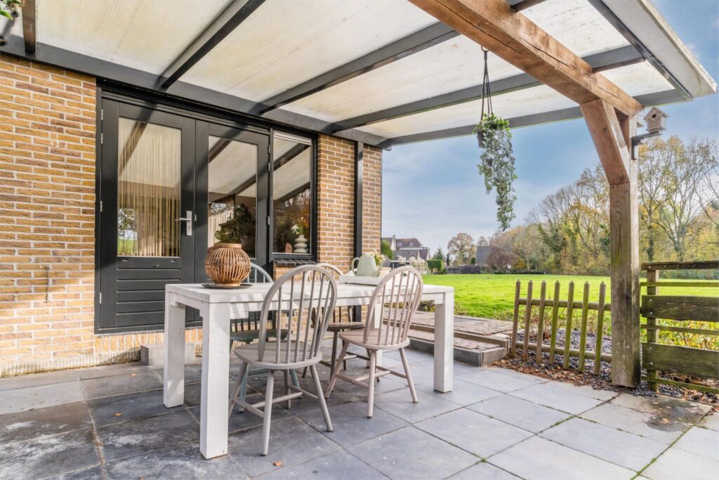 De fraai aangelegde tuin ligt royaal rondom de woning, waardoor je de hele dag door zon of schaduw kunt vinden. Of je nu van een kop koffie in de ochtendzon houdt of ’s avonds onder de overkapping wilt ontspannen: hier kan het allemaal.