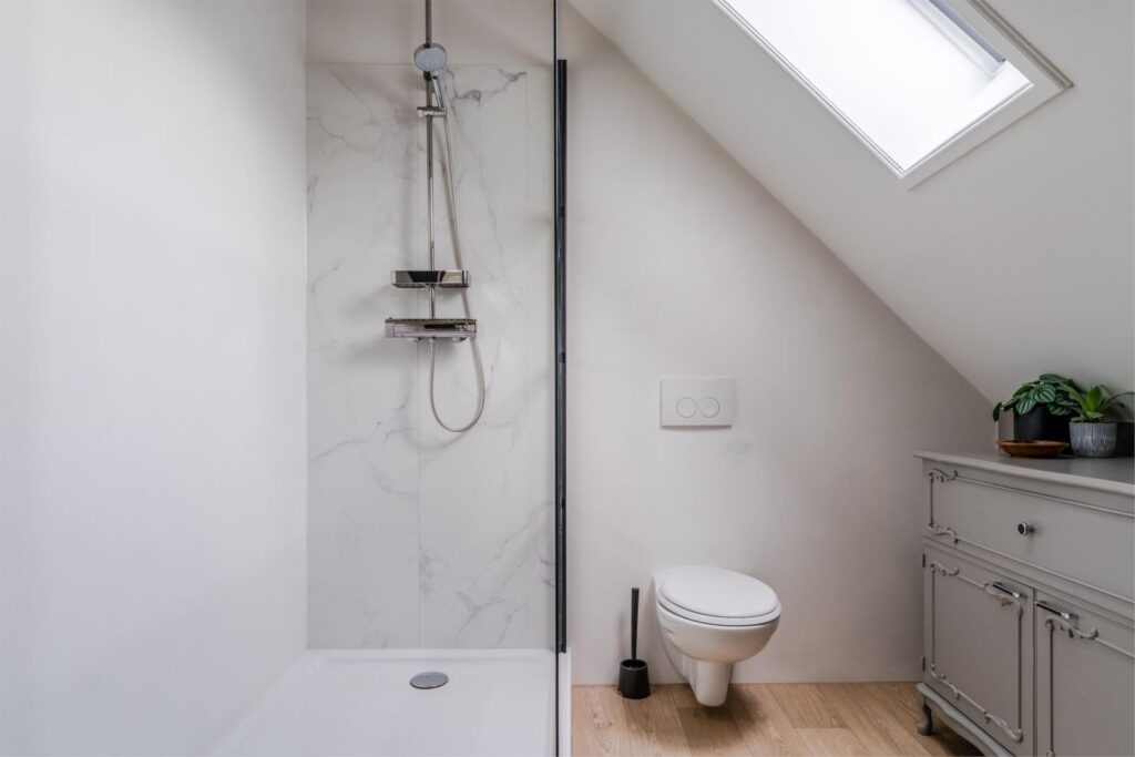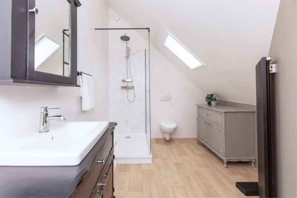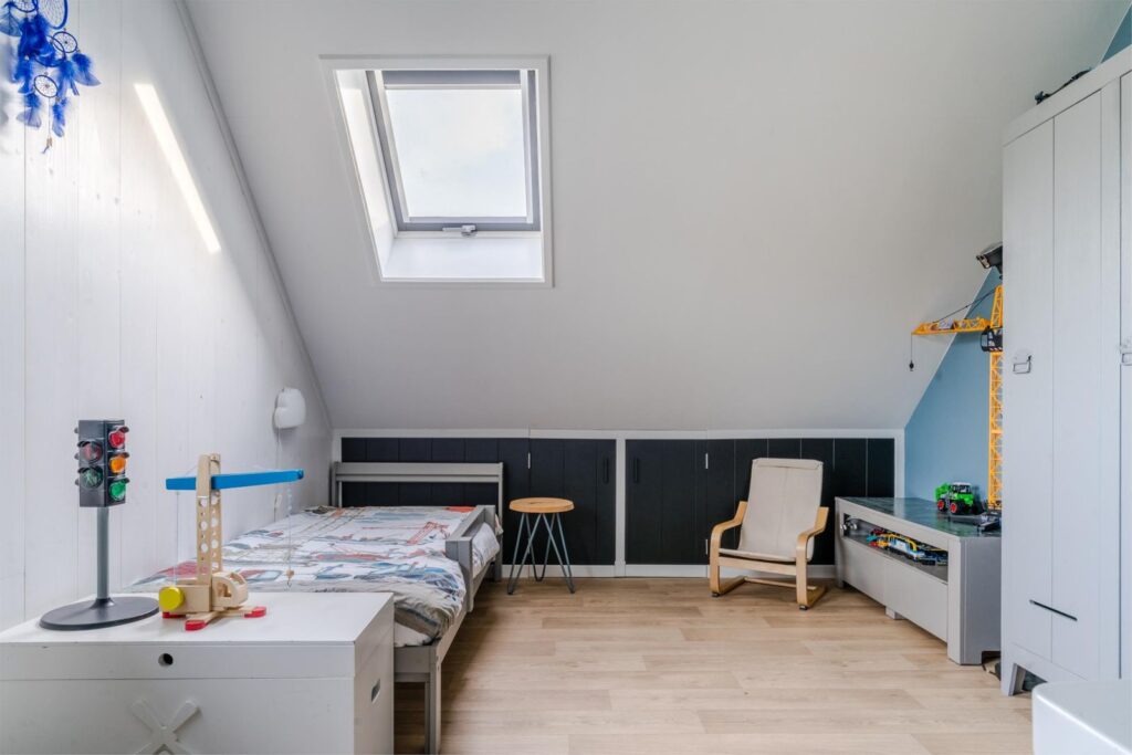 De woning is bij uitstek geschikt voor gelijkvloers wonen, met drie slaapkamers en een badkamer op de begane grond. Dat maakt het huis toekomstbestendig, maar ook ideaal voor grote (samengestelde) gezinnen of bijvoorbeeld een praktijk, kantoor of gastopvang aan huis. Op de verdieping vind je nog drie ruime slaapkamers, waarvan één met extra privacy, inloopkast en wastafel. Ook is er een tweede badkamer – volop ruimte voor gezin, hobby’s of logees.