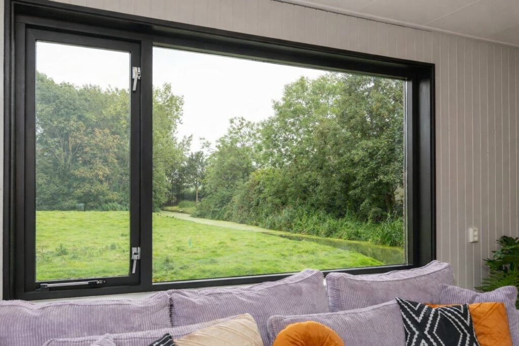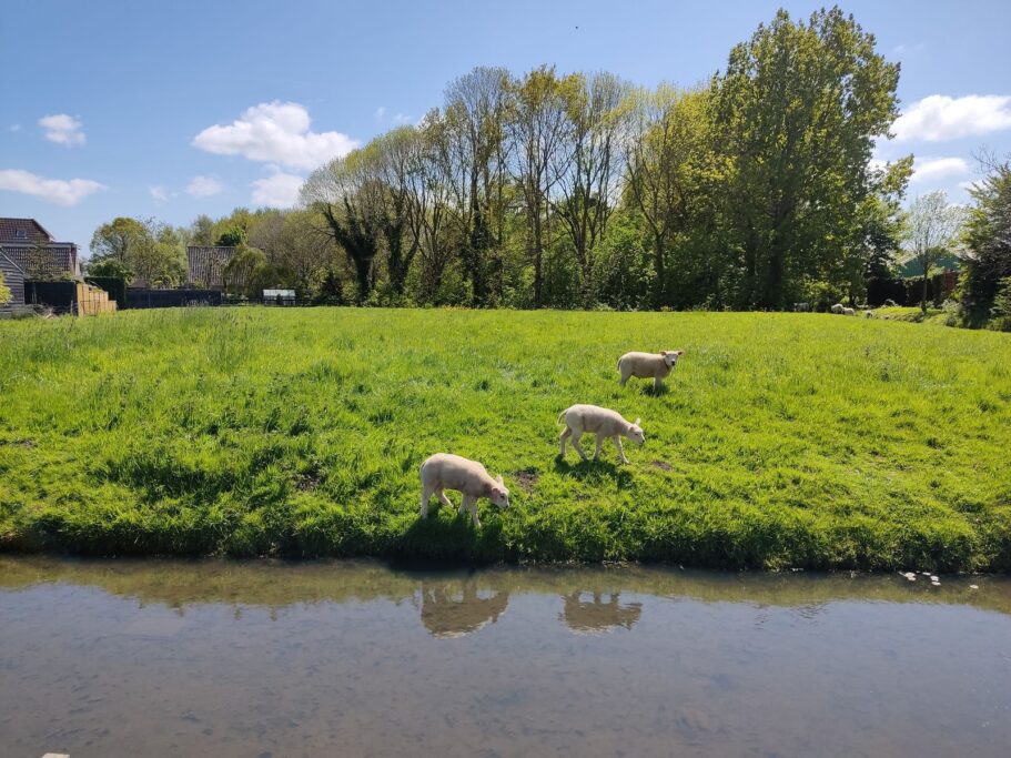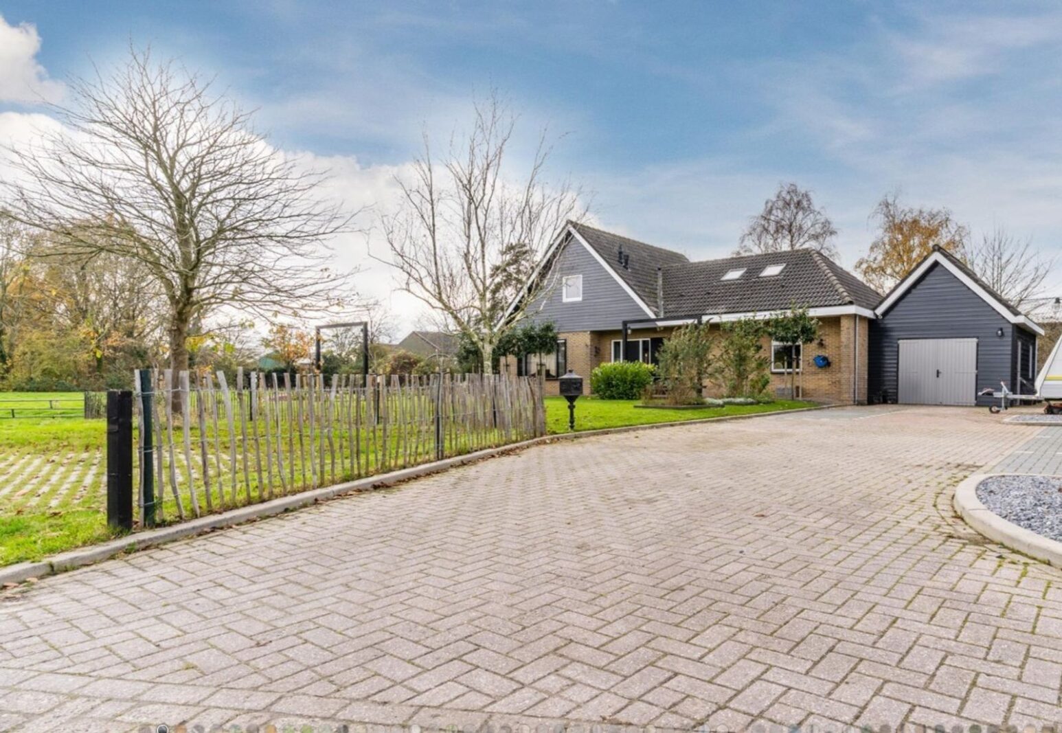 Vanuit de woonkamer kijk je uit over de modern aangelegde tuin aan de voorzijde en aan de zijkant over een heerlijk groen veld waar regelmatig schaapjes grazen – een levend schilderij dat elk seizoen verandert.
