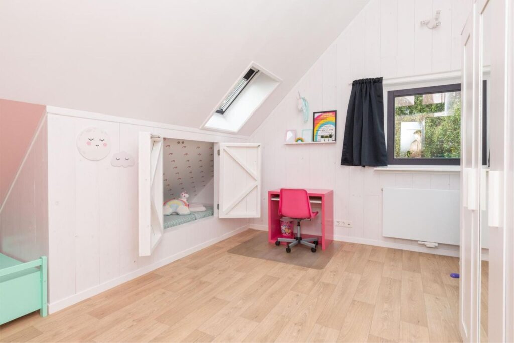 Eerste verdieping: overloop, ruime slaapkamer met extra privacy, inloopkast, wastafel, bergruimte en technische ruimte. Twee grote slaapkamers met speelse hoogte (waarvan één met gezellige kinderbedstede), tweede badkamer met douche, toilet en wastafelmeubel.