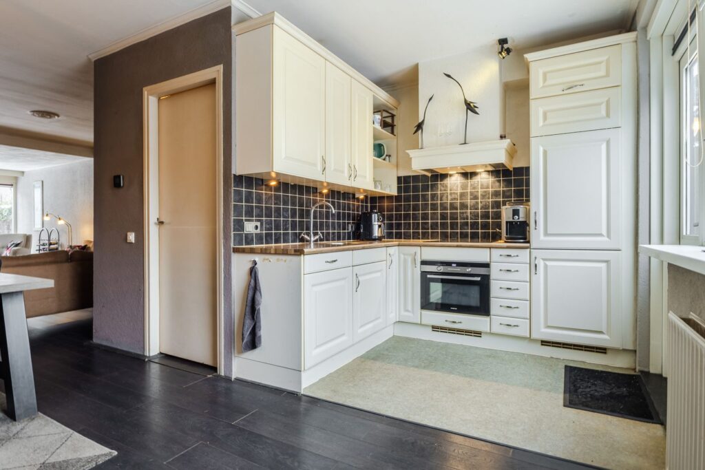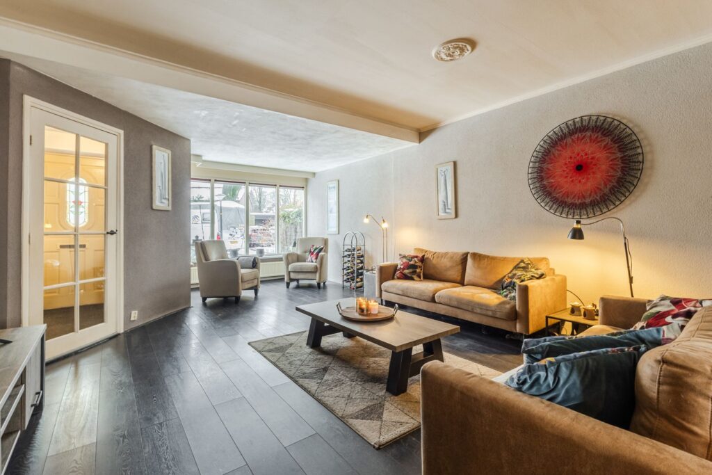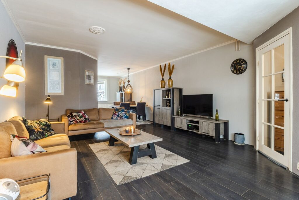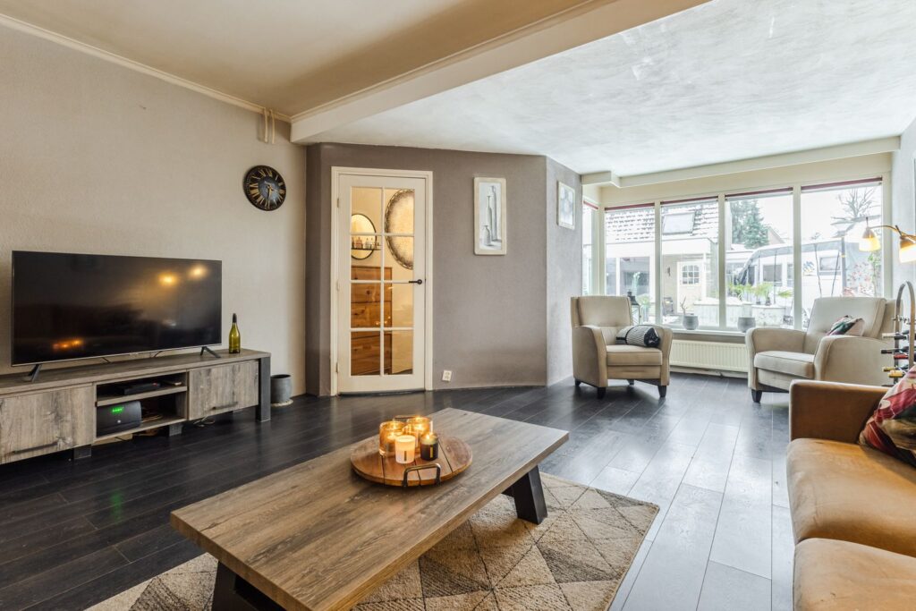 De woning is aan de voorzijde uitgebouwd op zowel de begane grond als de eerste verdieping. Hierdoor is er op de begane grond een heerlijk ruime woonkamer ontstaan met een groot zitgedeelte aan de voorzijde. De moderne open keuken (2008) bevindt zich aan de achterzijde en is voorzien van diverse inbouwapparatuur, waaronder een vaatwasser, inductiekookplaat, afzuigkap, combi-oven en een koel-/vriescombinatie. Vanuit de hal bereik je het toilet en de trap naar de verdieping.