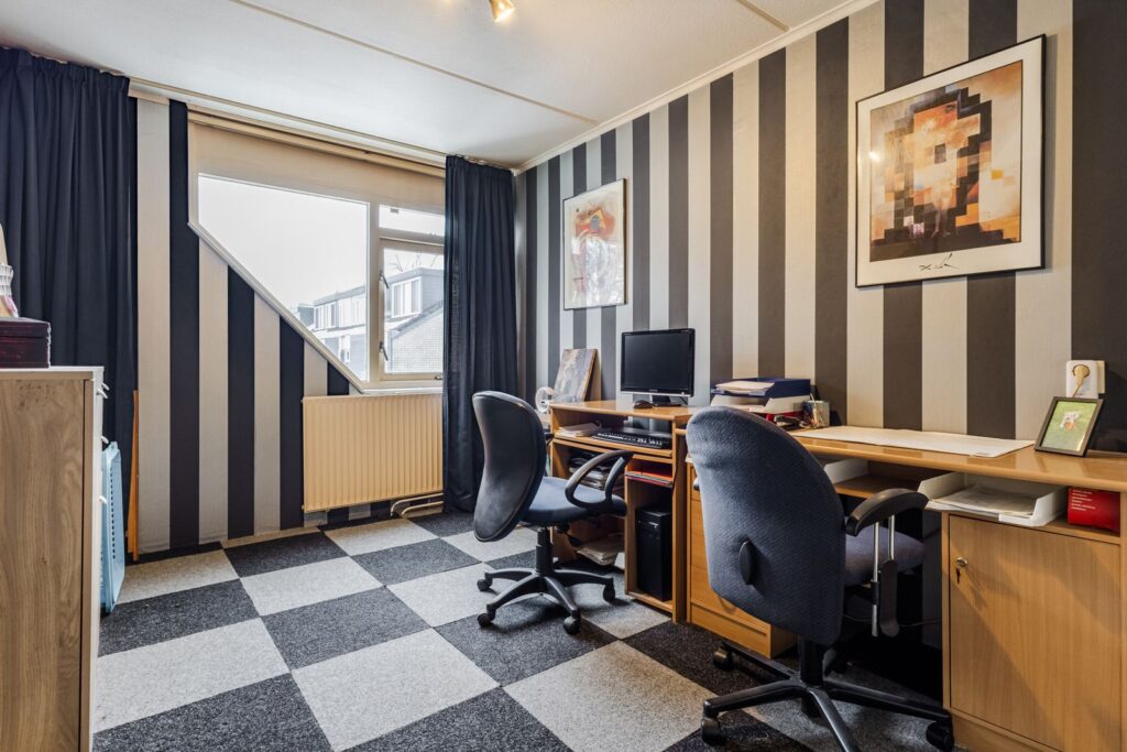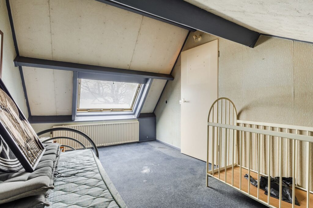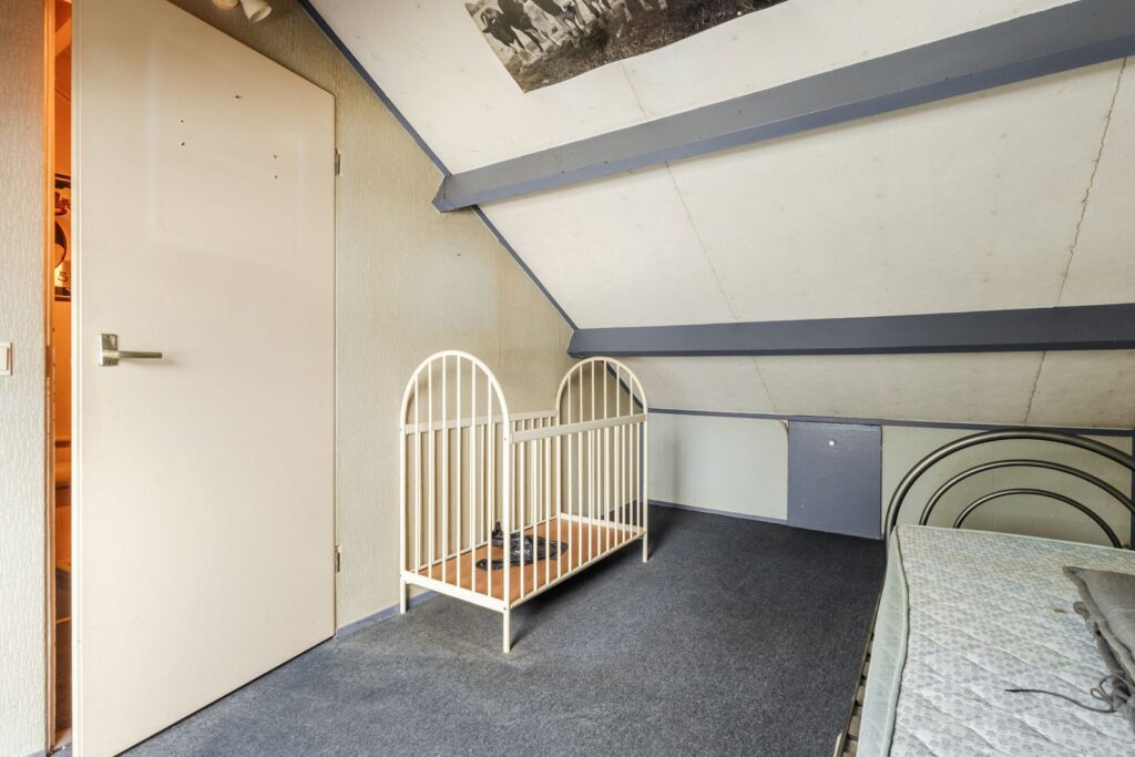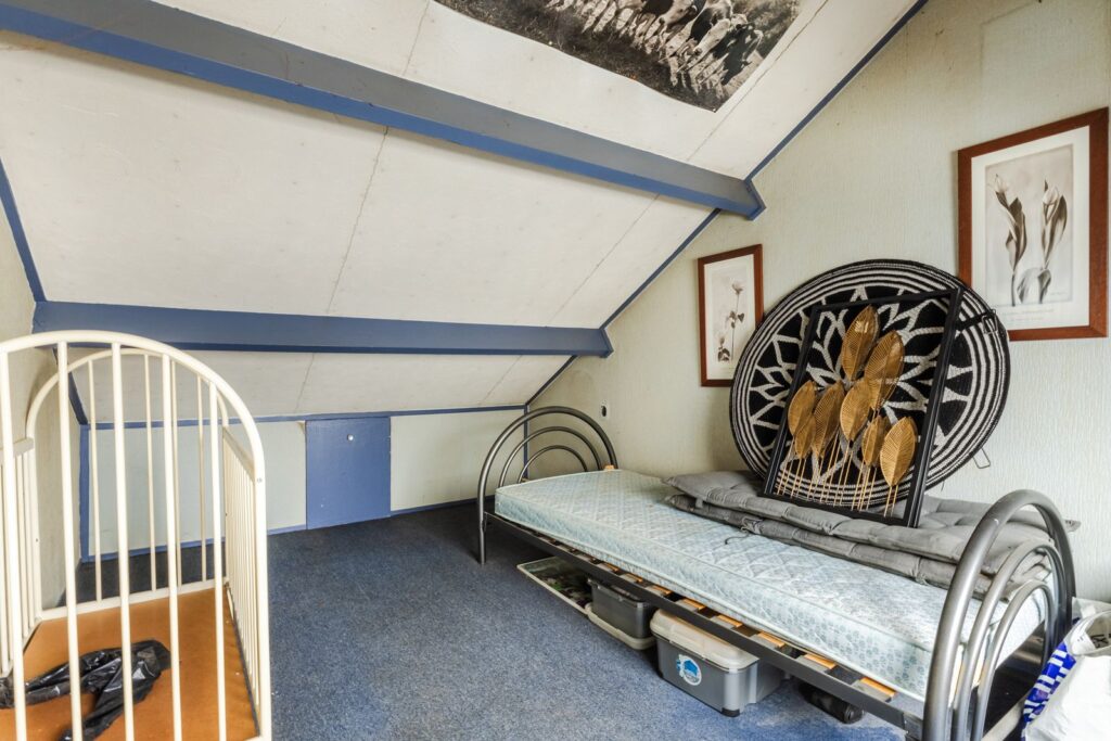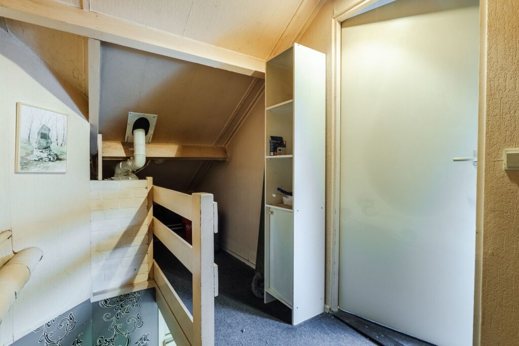 De tweede verdieping bestaat uit een overloop/voorzolder met de opstelling van de cv-combiketel (2020) en aansluitingen voor de wasapparatuur. Daarnaast is hier een volwaardige derde slaapkamer met dakraam en extra bergruimte.