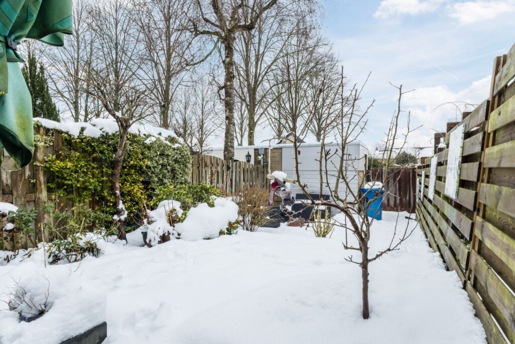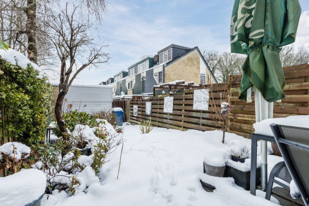 De achtertuin is diep en grenst direct aan een speelveld, wat zorgt voor veel privacy en een vrij gevoel. In de tuin staat een vrijstaande stenen berging, ideaal voor fietsen en tuinspullen.