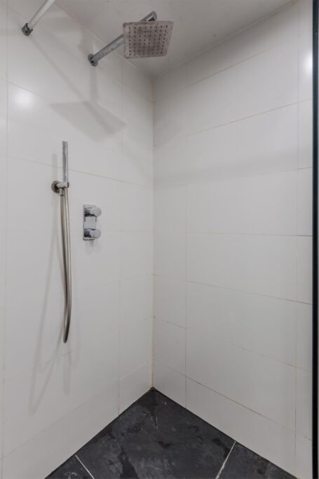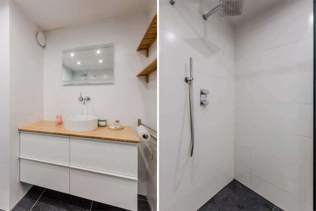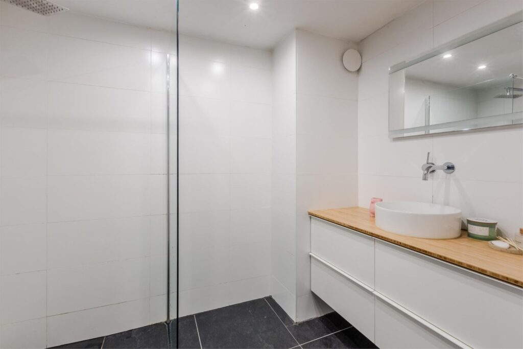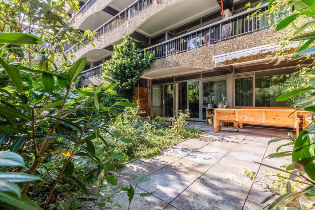 At the rear lies the garden, directly on the water – a lovely place to relax or enjoy a drink with friends. The apartment has two bedrooms, one of which faces the garden. The bathroom is modern and practical, featuring a walk-in shower and a washbasin. The washing machine is located in a separate closet in the hallway. The toilet is separate.