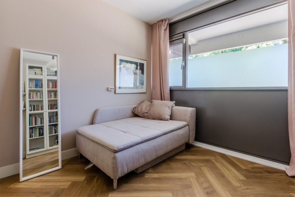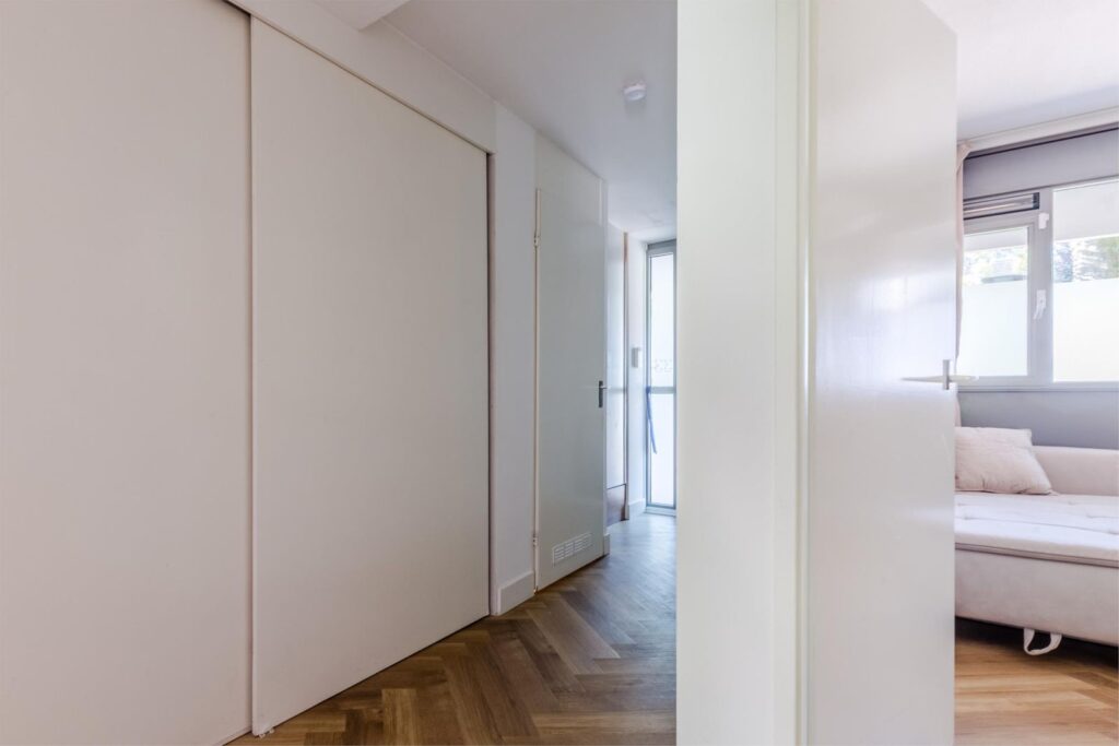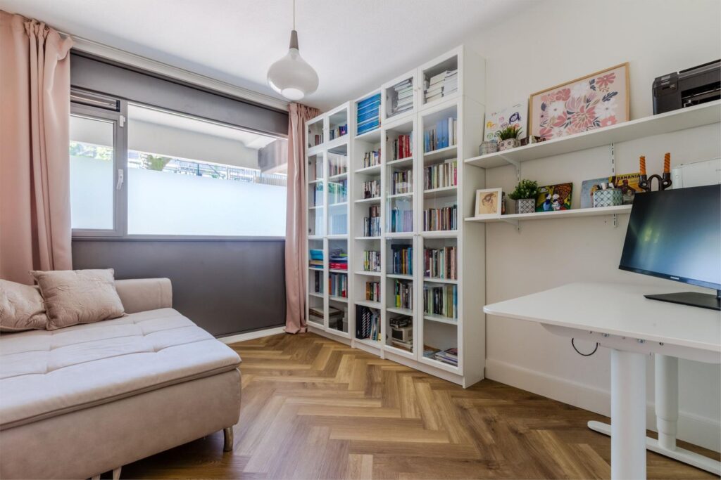 You reach the entrance of the home via the quiet courtyard. The hallway provides access to all rooms. The living room is bright and spacious, with large windows that create a pleasant connection to the outdoors. The open kitchen (new in 2025) is equipped with modern built-in appliances and offers space for a cozy dining area.