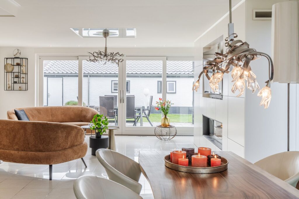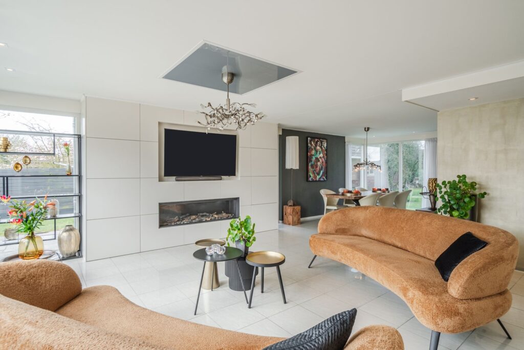 Via de entree kom je in de hal met ruime afgesloten garderobekast en de meterkast. Een glazen deur geeft toegang tot de woonkamer, waar je direct zicht hebt op de tuin. De ruimte voelt licht en open aan en biedt volop mogelijkheden voor een comfortabele grote zithoek en eethoek. De woonkamer beschikt over een grote schuifpui die veel licht binnenlaat en opent naar het terras in de achtertuin op het Zuiden. De keuken is uitgevoerd in hoogglans zwart, volledig uitgerust met vaatwasser, combimagnetron, koelkast en 4 pits inductie kookplaat. Deze geeft uitzicht op de voortuin. De sfeervolle gashaard met realistisch ogend hout zorgt voor een warme en gezellige uitstraling in de woonkamer.