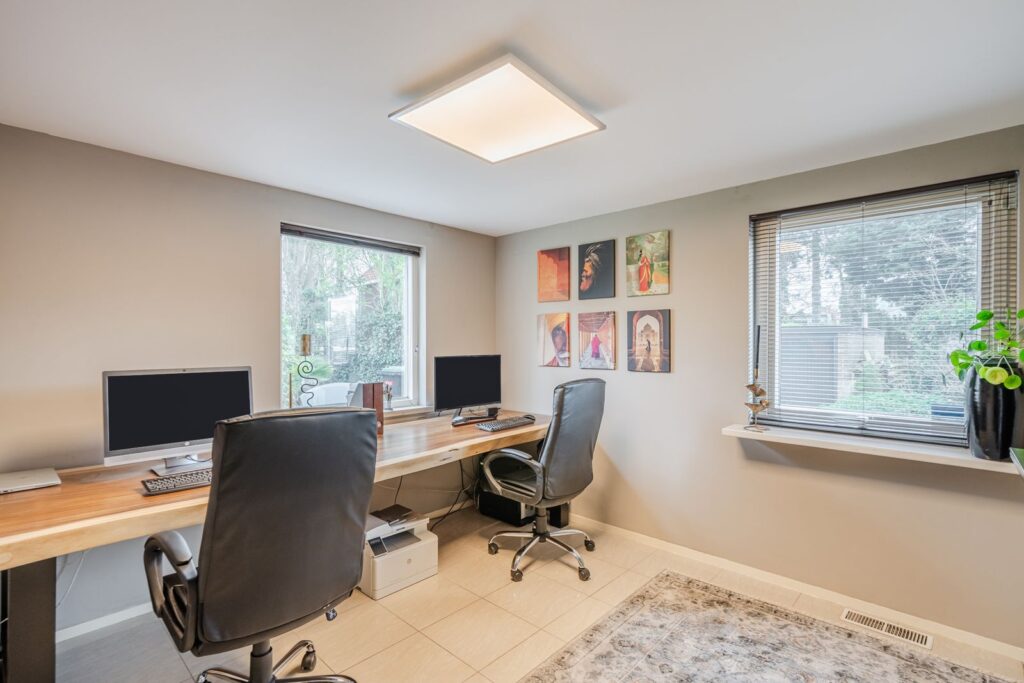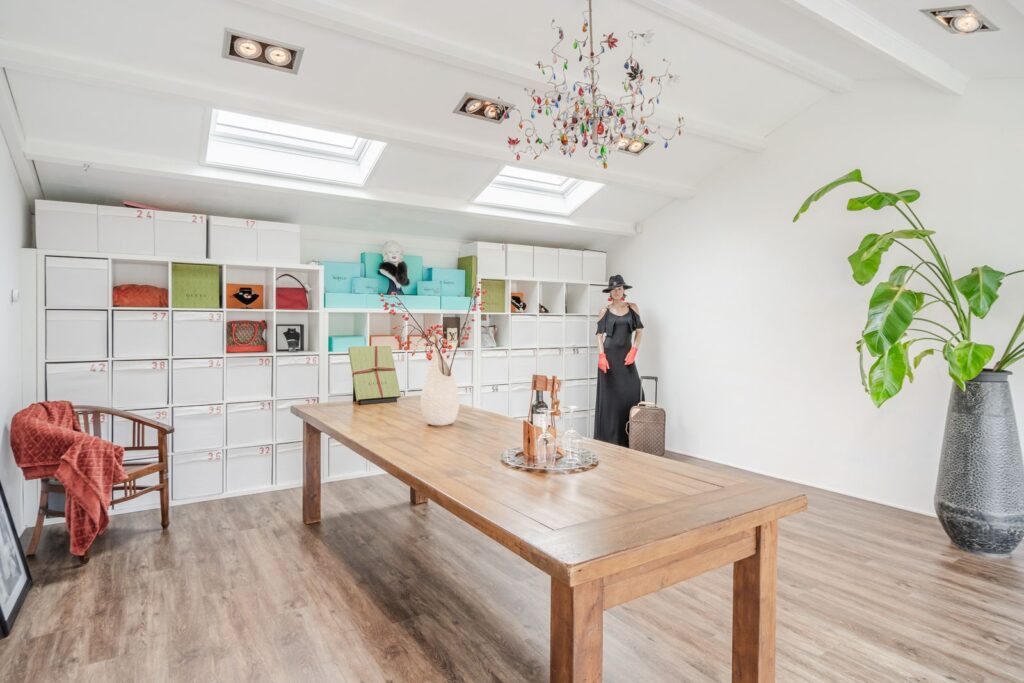 Achter op het perceel bevindt zich een vrijstaand bijgebouw dat uitstekend geschikt is als atelier, kantoor aan huis, gym of praktijkruimte. Geheel geïsoleerd en voorzien van vloerverwarming met eigen badkamer/toilet.