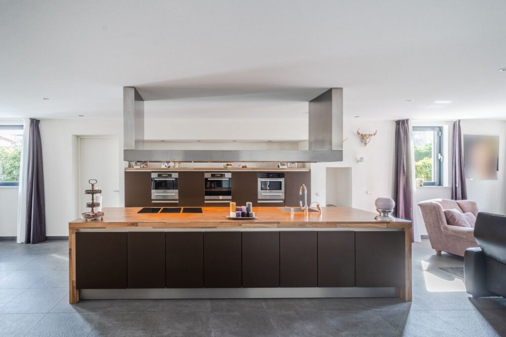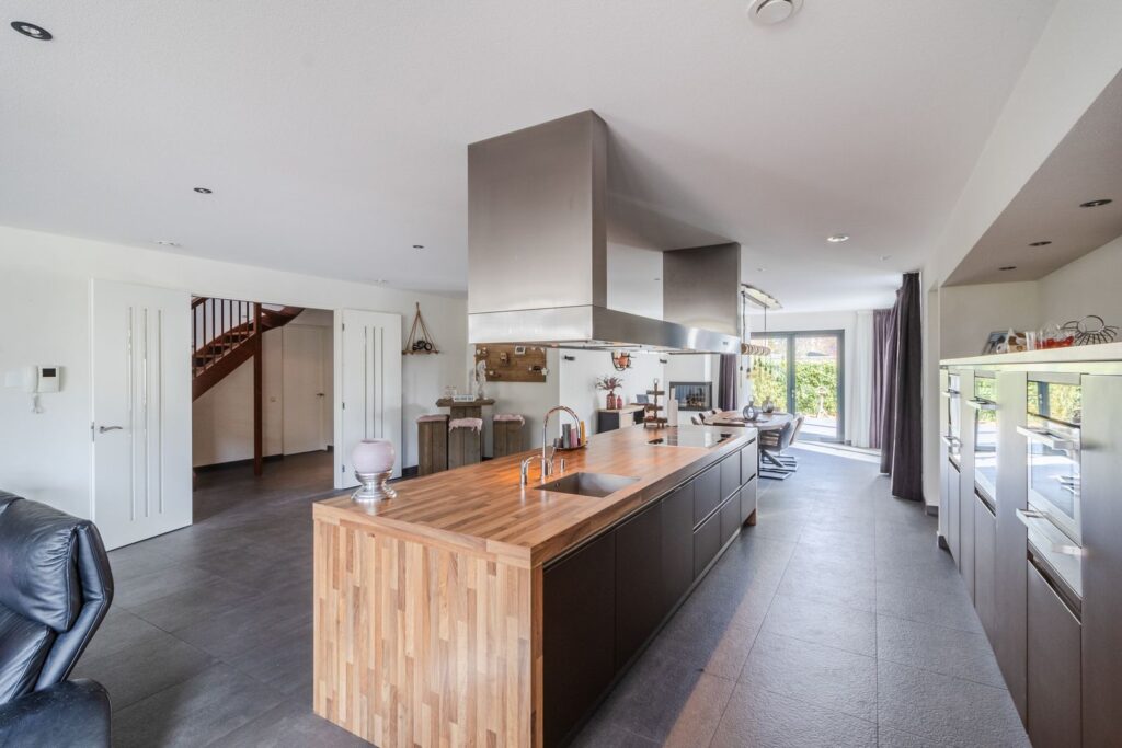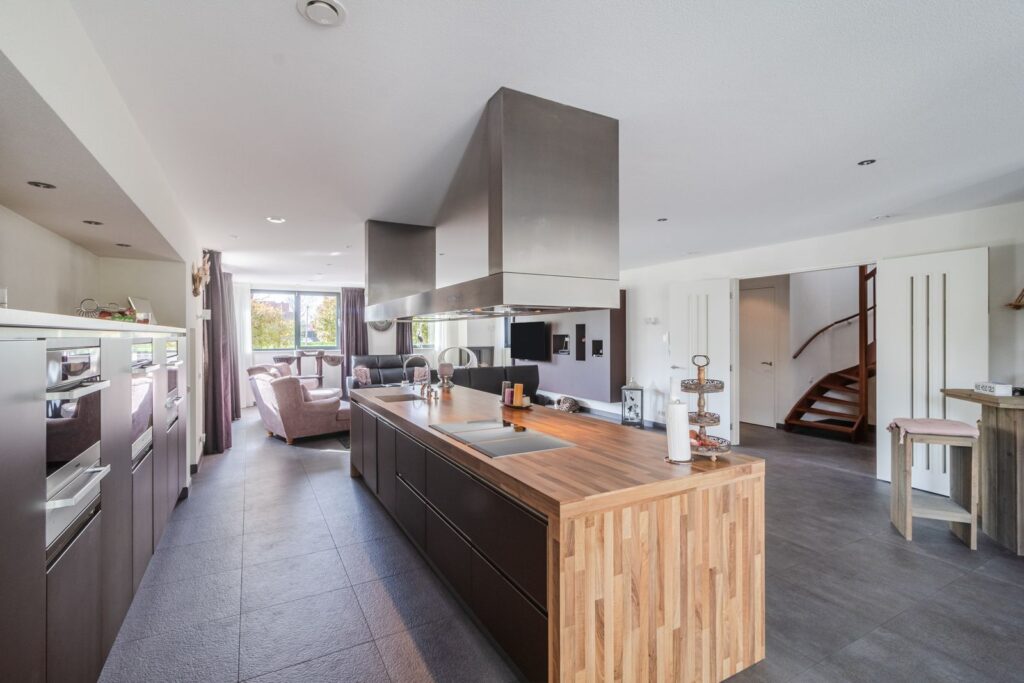 * luxe open keuken met kookeiland en inbouwapparatuur;