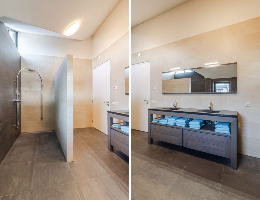 Badkamer met inloopdouche en dubbele wastafel