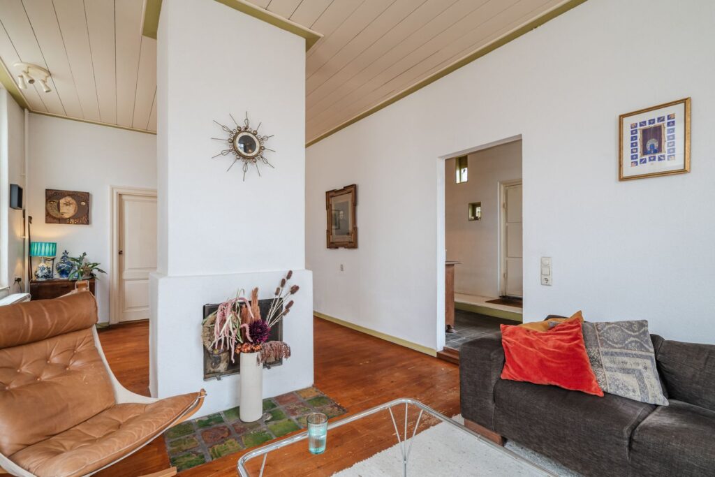 Begane grond: via de entree met stijlvolle oude hardstenen vloer betreedt u de gezellige woonkamer met in het midden een grote open haard en een prachtig houten plafond.