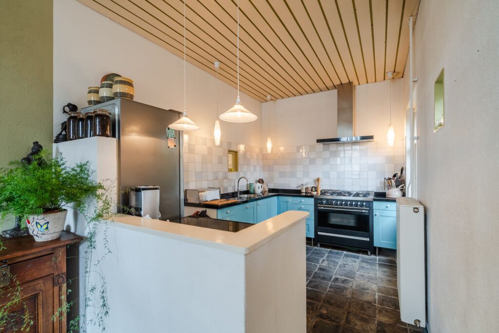 Vanuit de woonkamer is toegang naar de woonkeuken en de keuken zelf, die voorzien is van een zwart granieten blad.