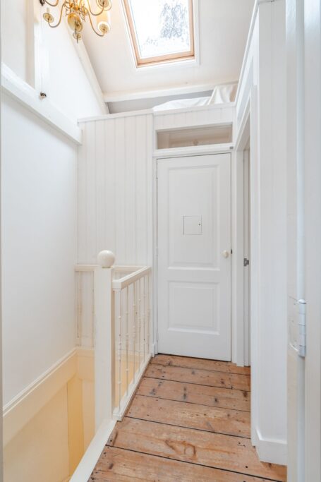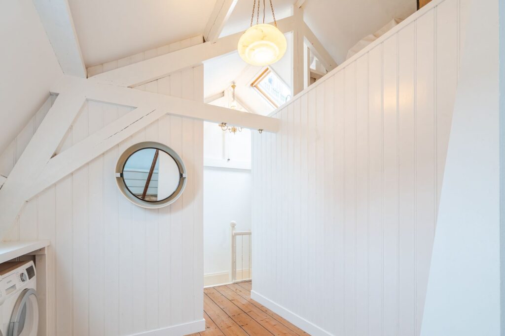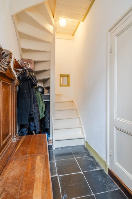 1e verdieping: vanuit de de gang bereik je via een houten wenteltrap de bovenste verdieping. Op deze verdieping bevindt een overloop met wasruimte, de badkamer en vier slaap/werkkamers.