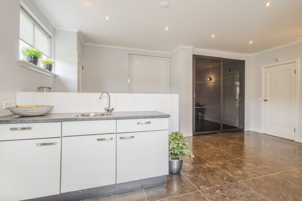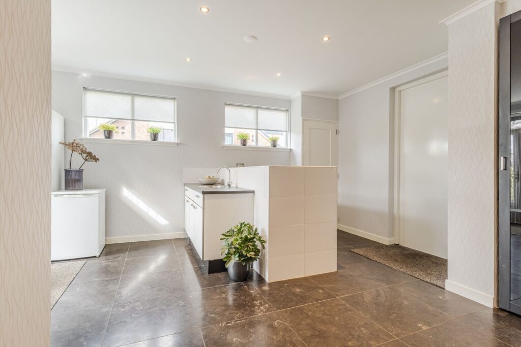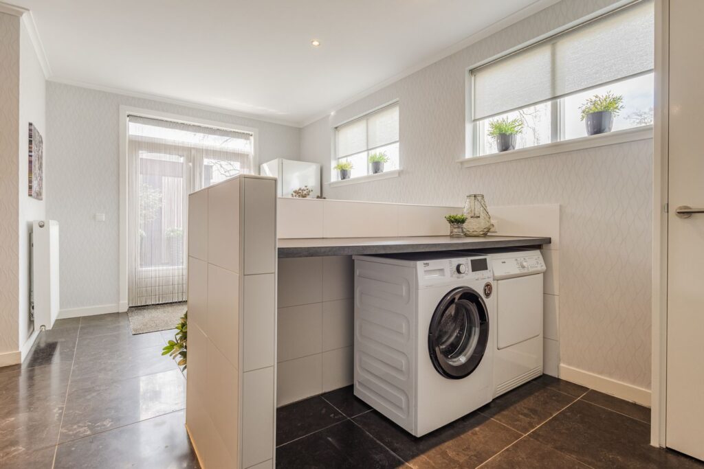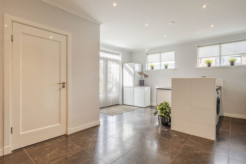 Vanuit de keuken bereikt u de royale en lichte bijkeuken van circa 27 m². Deze praktische ruimte is voorzien van een keukenblok en biedt volop plaats voor wasmachine en droger. Daarnaast bevindt zich hier een nette toiletruimte met toilet, fontein en urinoir.