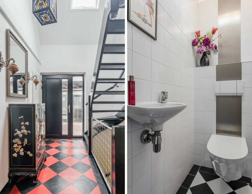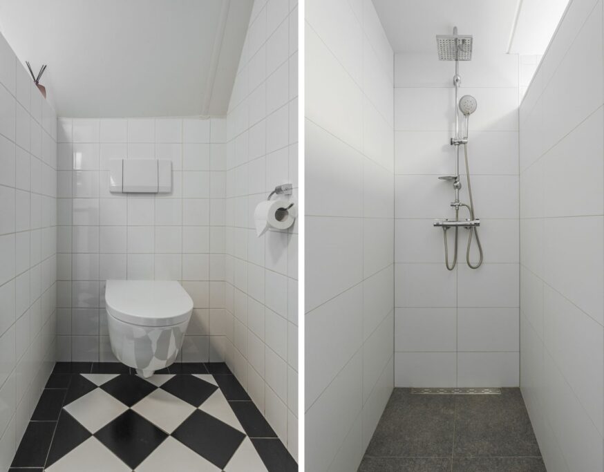 Eerste verdieping: overloop, royale slaapkamer met walk-in closet (voorheen twee slaapkamers), tweede slaapkamer, ruime lichte badkamer met vloerverwarming, tweede toilet, ruime inloopdouche, dubbele wastafel, bad en designradiator. Beide slaapkamers zijn in 2024 over de gehele breedte voorzien van een dakkapel.