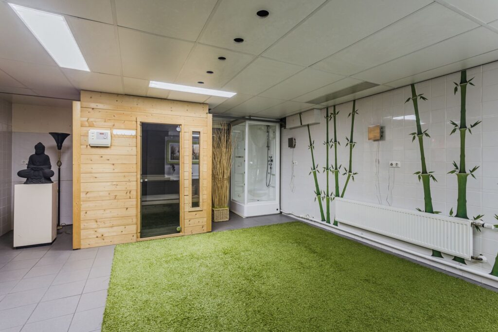 Souterrain: via een vaste trap in de hal bereikt u de wellness-ruimte (7,4 x 5,1 meter) met whirlpool, douche en sauna. Daarnaast is er een multifunctionele ruimte (7,4 x 4,9 meter), welke zich goed leent voor bijvoorbeeld een thuisbioscoop, kantoor, hobby- of workshopruimte. Het souterrain beschikt over twee ramen. De hoofdinstallatie van het centrale stofzuigsysteem bevindt zich eveneens hier.