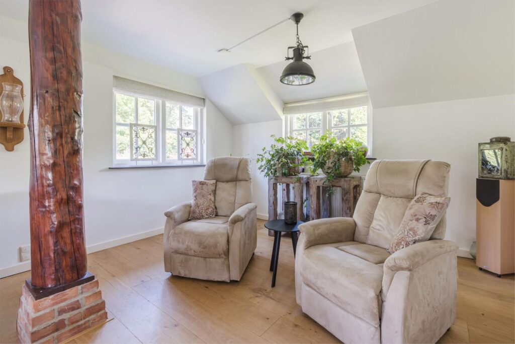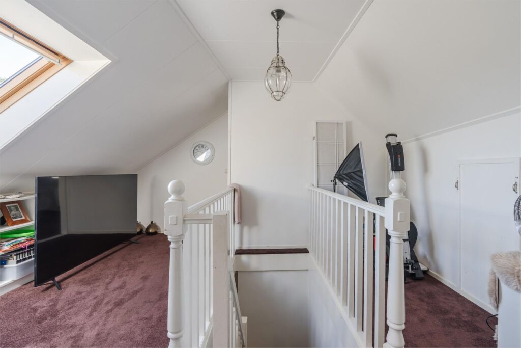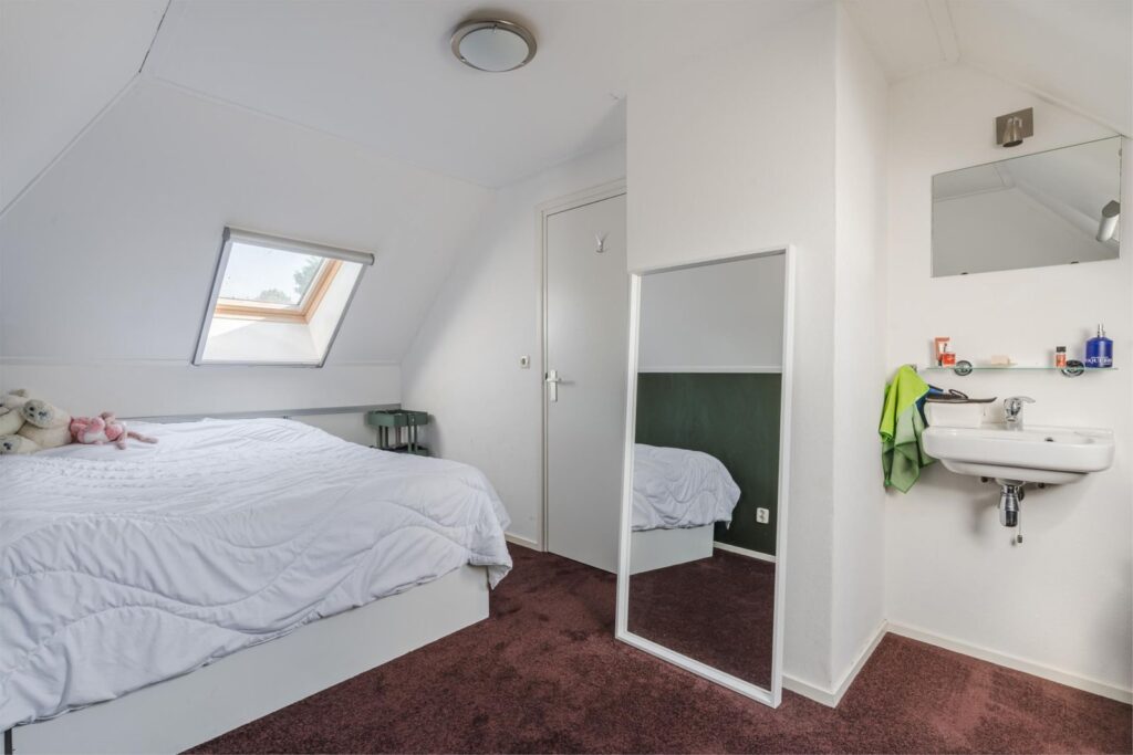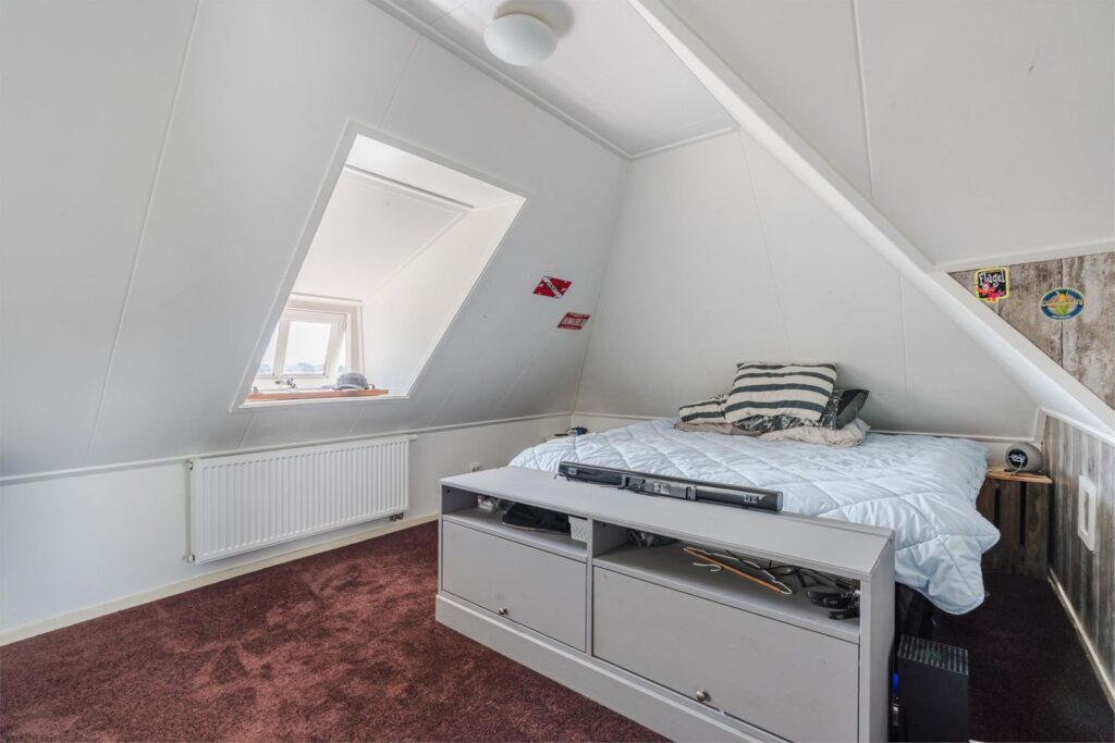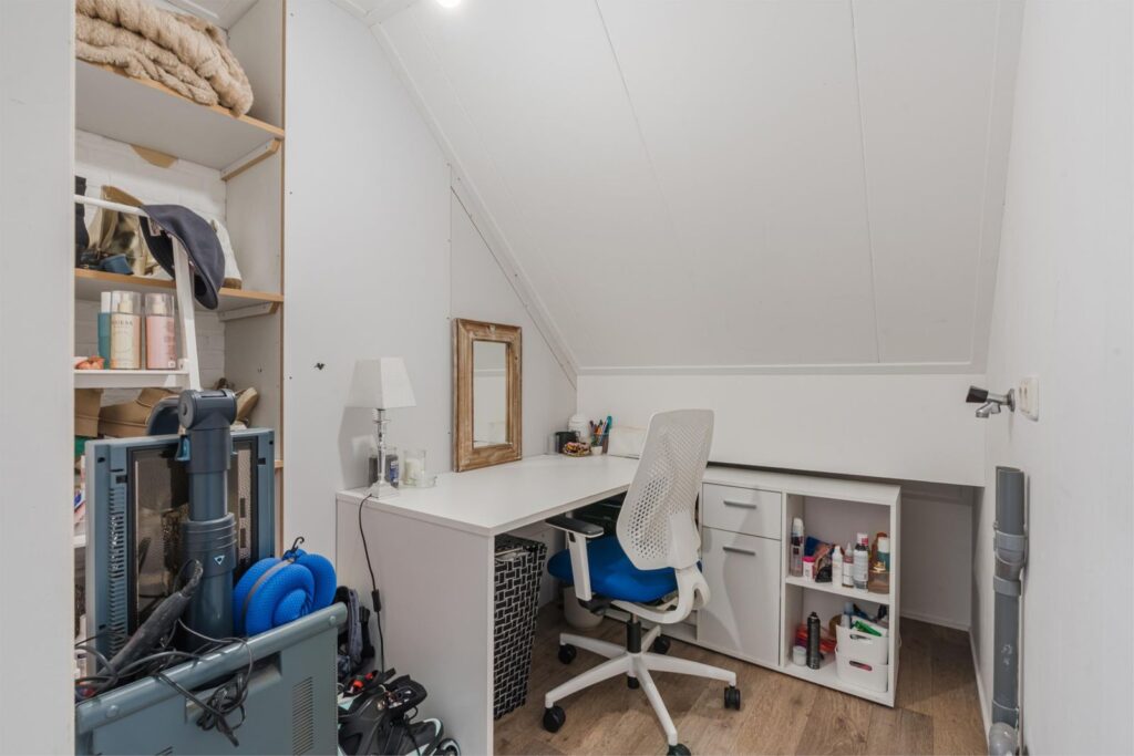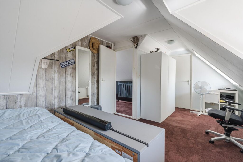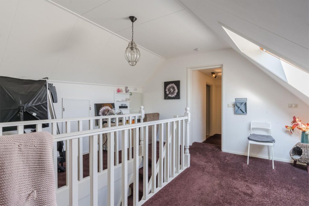 Via de vaste trap komt u op de verdieping welke ruimte biedt aan een vide met werkplek en twee royale slaapkamers. De gehele kap is goed geïsoleerd en de rieten kap is recent onderhouden. Op de verdieping vind u tevens een kleinere ruimte welke voorzien is van aansluiting voor wasmachine / droger en waarin het ventilatiesysteem is ondergebracht. Deze ruimte kan eventueel verbouwd worden naar kleine badkamer. Op de verdieping vindt u een royale en diepe vaste kastenwand. Naast de zeer royale slaapkamer aan de voorkant waar u direct uitkijkt op het natuurgebied "de Wieden" vind u een kleinere opslagruimte voor kleding / opslag. Slaapkamer aan de achterzijde van de woning is voorzien van twee grote Velux dakramen met verduisteringsgordijnen en wastafel met spiegel.