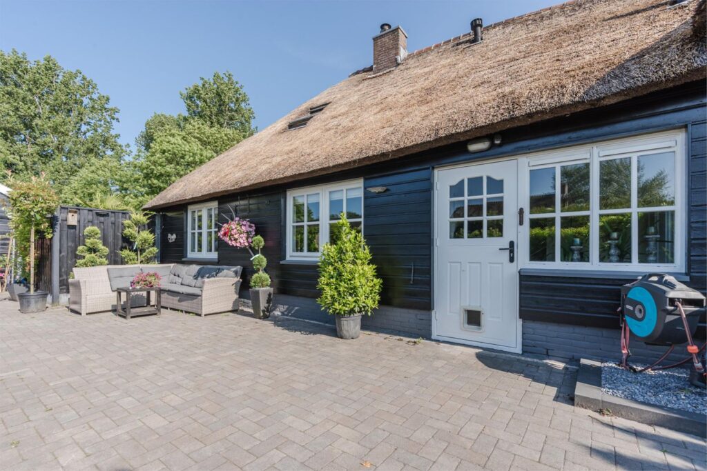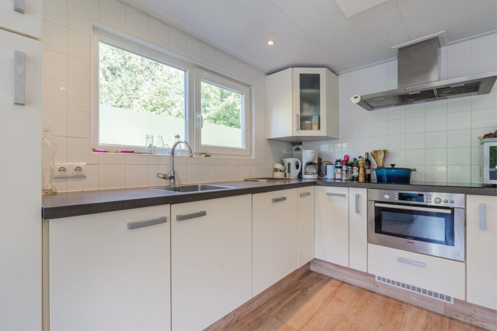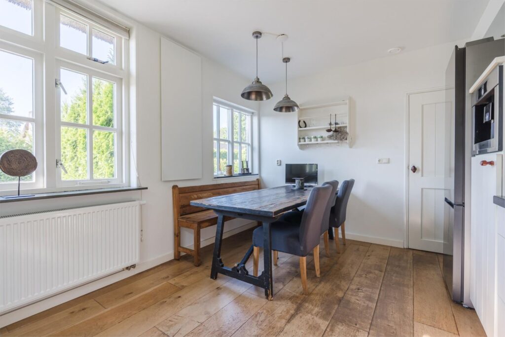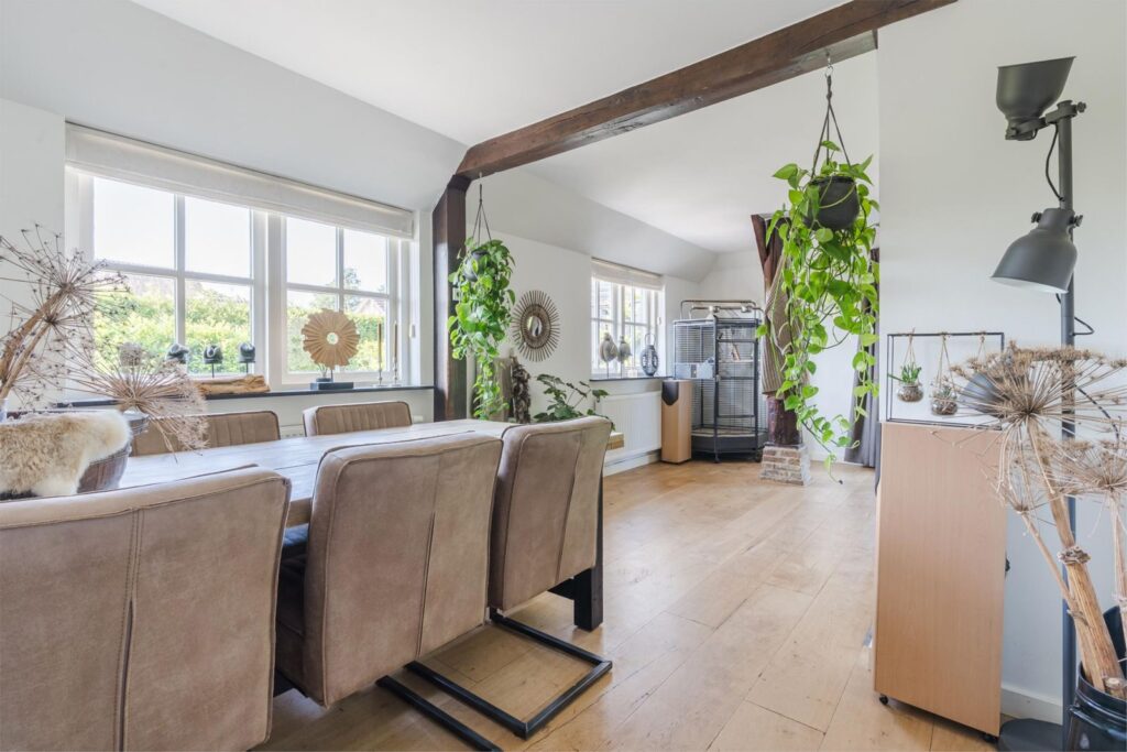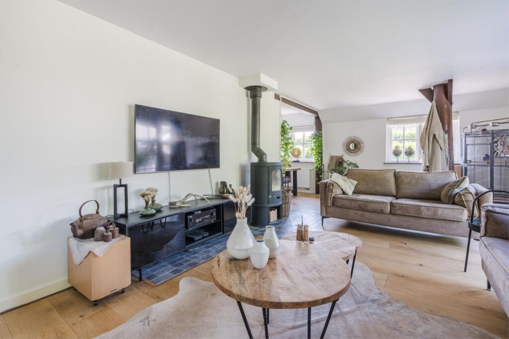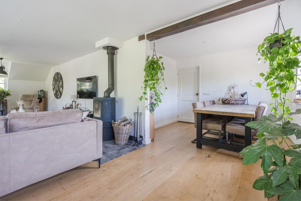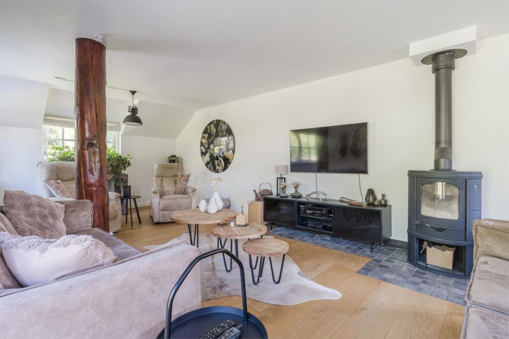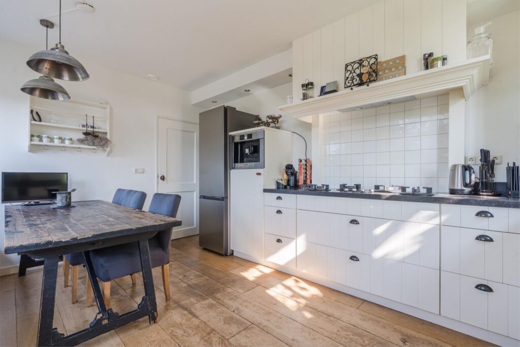 Zij-entree met royale hal die in directe verbinding staat met de royale woonkamer en woonkeuken, toiletruimte, zeer royale slaapkamer met kledingkast, moderne badkamer met inloopdouche, dubbele wastafel, royaal bad en hangend toilet en 2 x een werkkamer/opslag of slaapkamer. De sfeervolle lichte woonkamer is uitgerust met nog originele elementen en gesitueerd aan de achterzijde van de woning met openslaande tuindeuren en directe toegang tot het zeer royale terras en fraai aangelegde tuin met vijverpartij. Woonkamer is recent geheel opnieuw gesaust, voorzien van houtenvloer en wordt heerlijk verwarmd (naast evt. CV als bijverwarming) door in 2024 aangekochte speksteen kachel. Aan de voorzijde van de woning vind men de woonkeuken welke is voorzien van diverse inbouwapparatuur als een 4-pits geïntegreerd gasfornuis, oven, magnetron, afzuigschouw, vaatwasser, inbouw bonen koffiezetapparaat en ladenkoelkast.