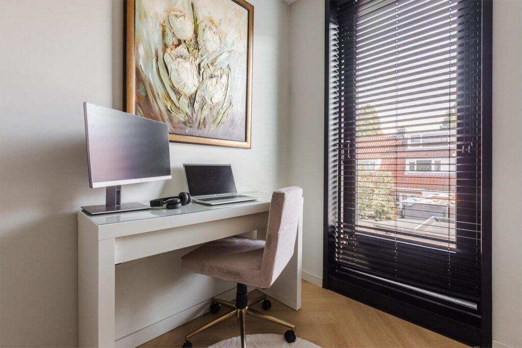 • Twee uitgebouwde lichte kamers aan de achterzijde, waarvan één nu in gebruik als werkkamer met toegang tot het dak, en één als ruime slaapkamer