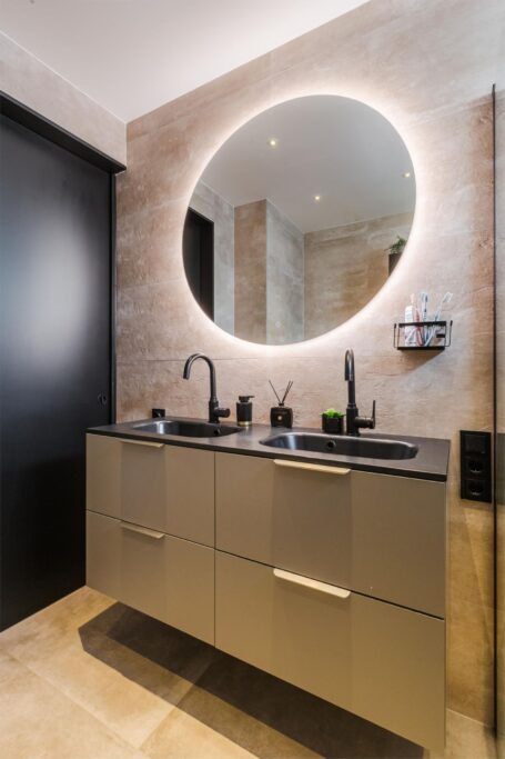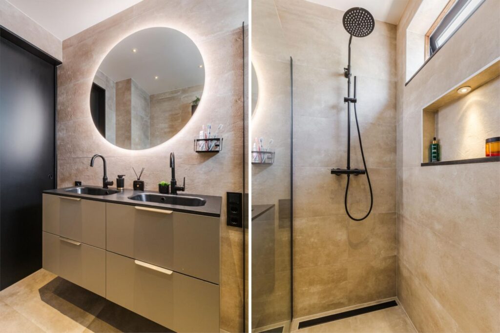 • Fraaie badkamer met inloopdouche, hangend toilet, dubbele wastafel, designradiator en een verlichte en verwarmde spiegel