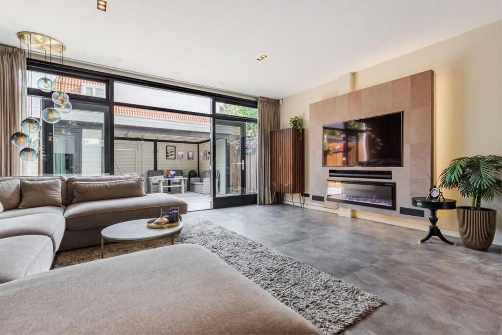 • Verrassend ruime en lichte woonkamer met PVC-vloer, vloerverwarming, cinewall, dichte trap en openslaande deuren naar de tuin