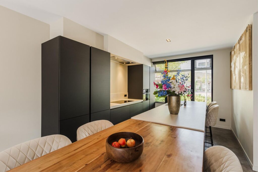 • Luxe open keuken met eiland en barfunctie, voorzien van hoogwaardige inbouwapparatuur zoals koel-/vriescombinatie, vaatwasser, afzuiginstallatie, combi-oven, close-in boiler en wijnklimaatkast