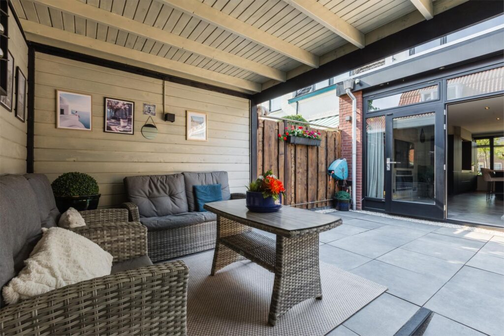 • Onderhoudsvriendelijke tuin op het zuiden met overkapping, schuur, achterom en verlichting (2023)