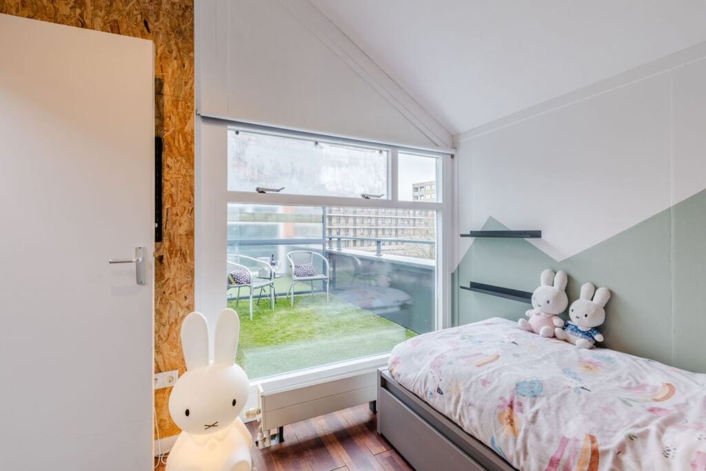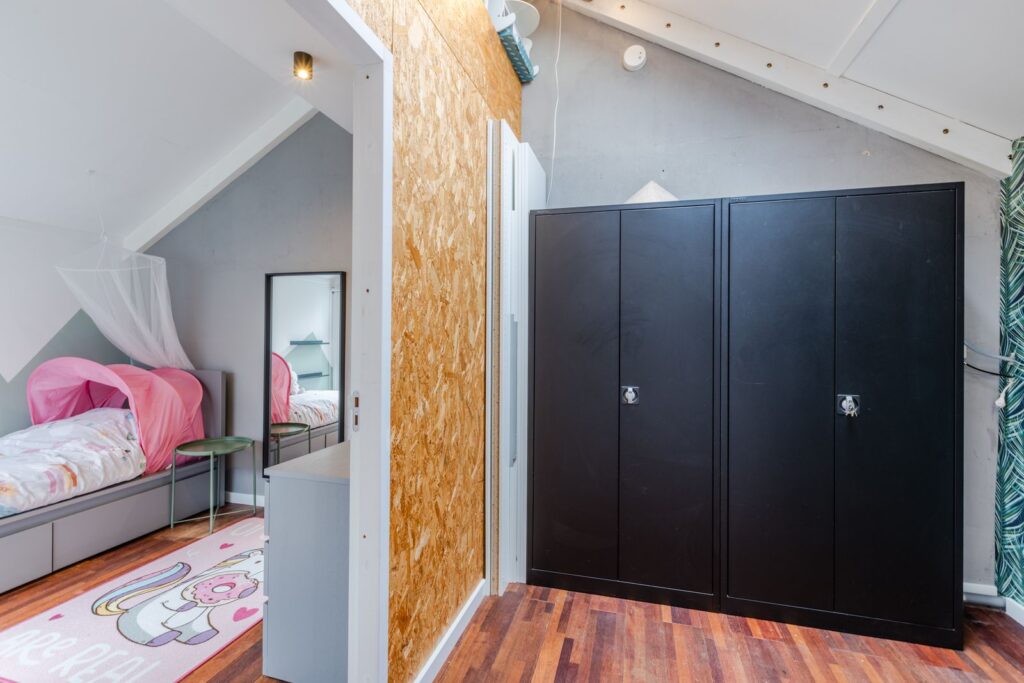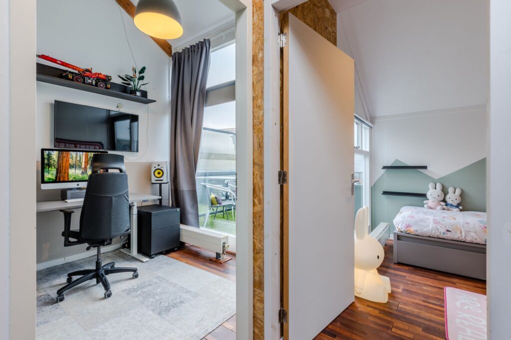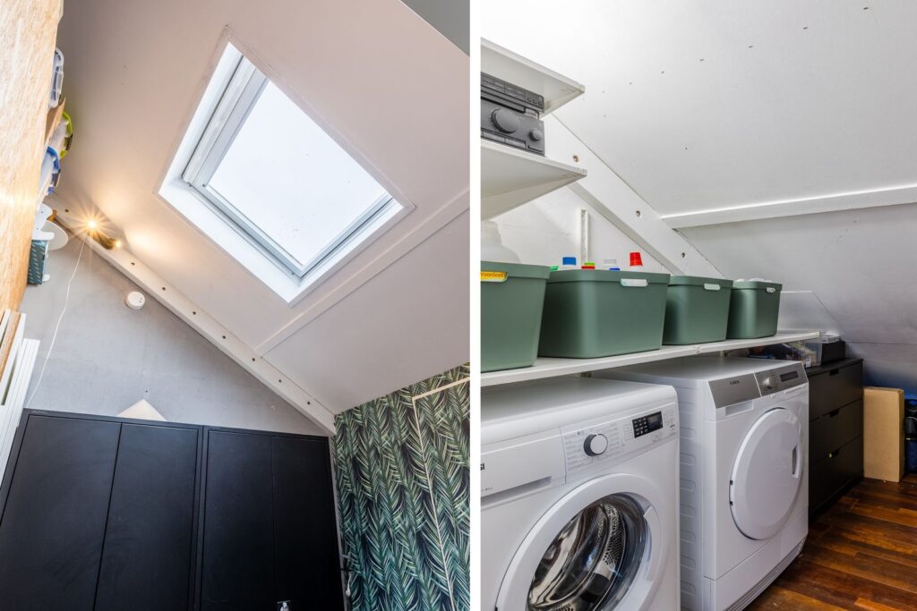 Een speelse, verrassend ruime verdieping met hoge nok, 2 slaapkamers en 2 grote bergingen. Er is bovendien een extra zoldertje gemaakt voor nog meer opbergruimte. Praktisch: aparte groepen voor wasmachine en droger. Extra pluspunten: op deze verdieping is ook een balkon aanwezig en op de overloop zorgt een Velux dakraam voor prettig daglicht.