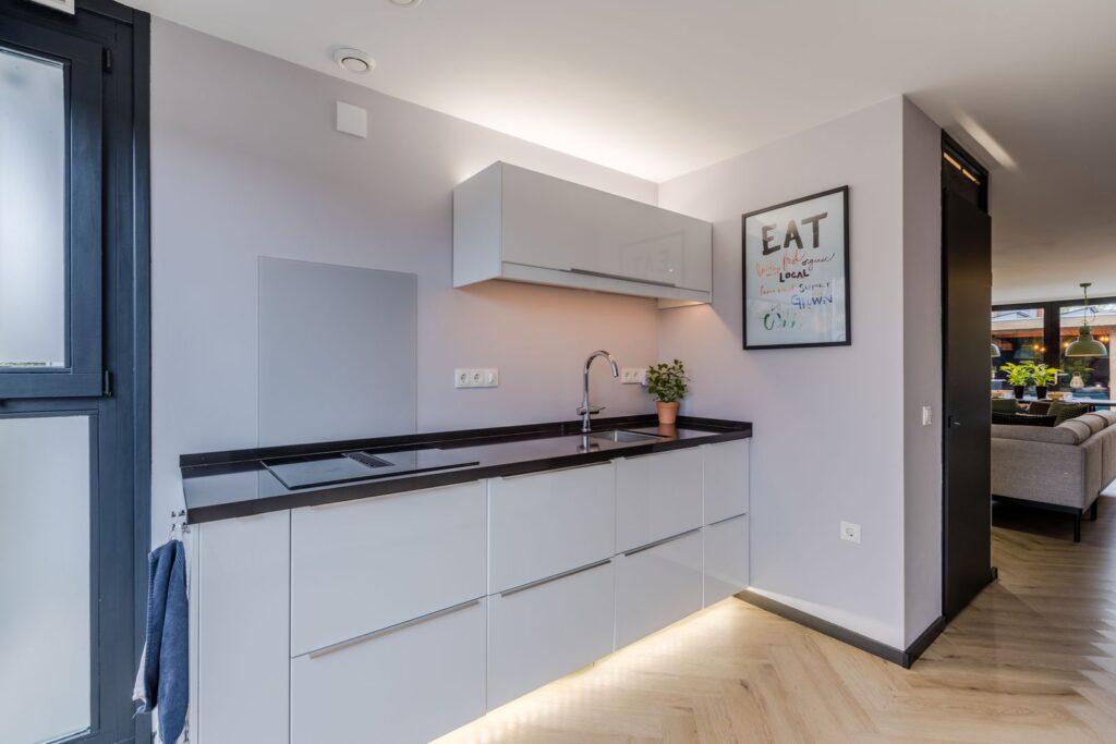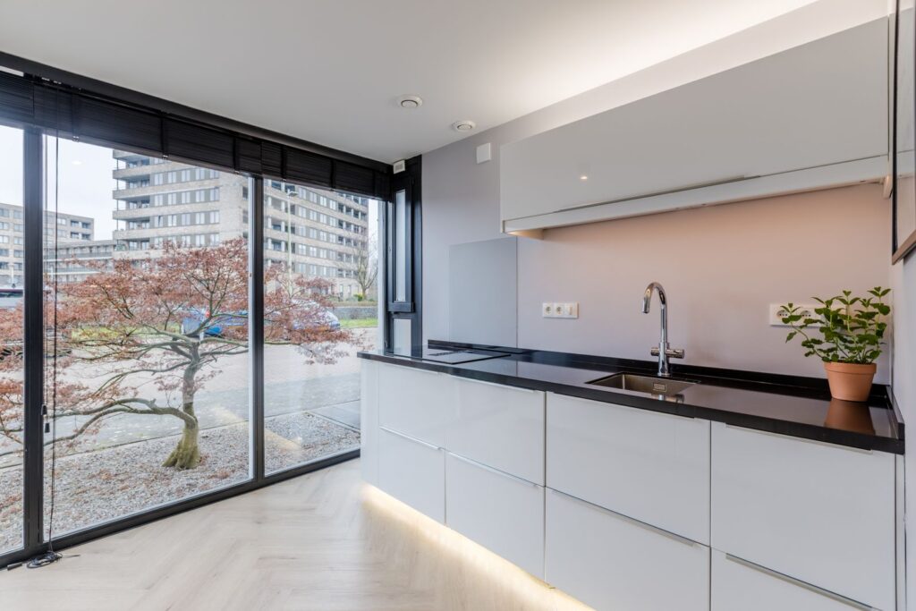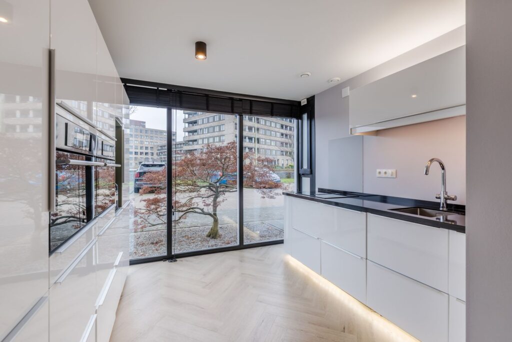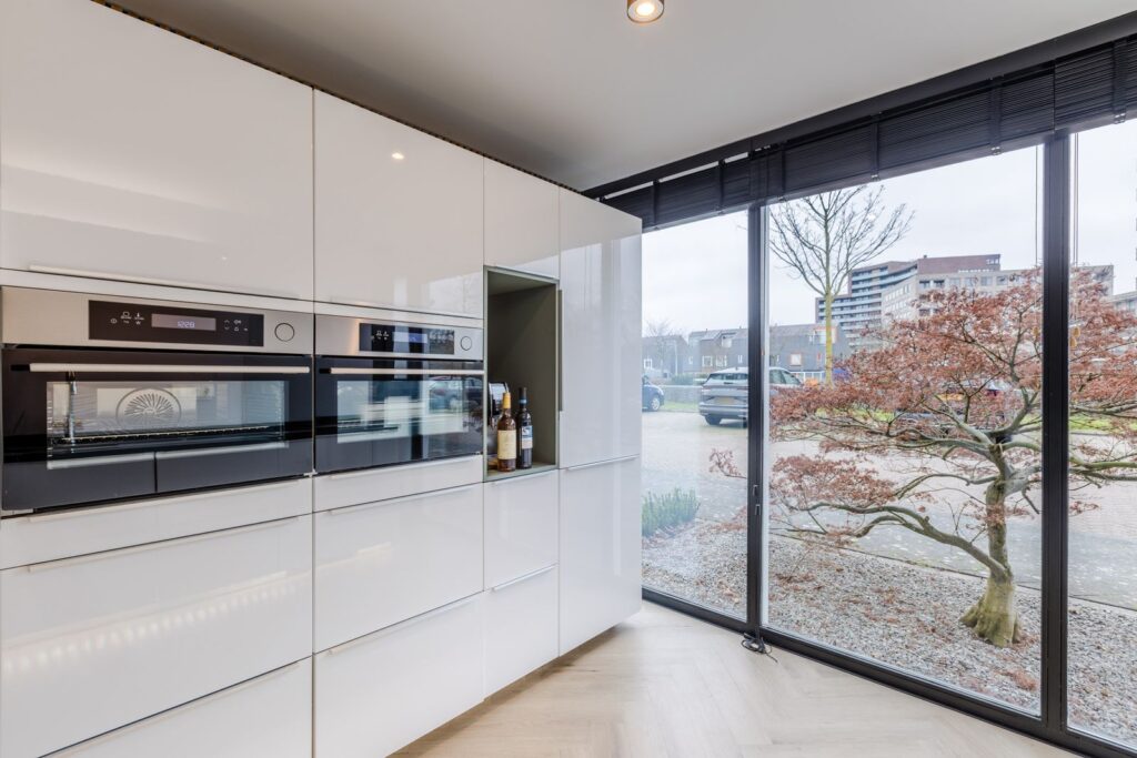 Binnenkomst in een fijne, lichte woonlaag met een moderne keuken voorzien van o.a. kokendwaterkraan, inductiekookplaat met geïntegreerde afzuiging, twee combi-stoomovens en een koel-/vriescombinatie.