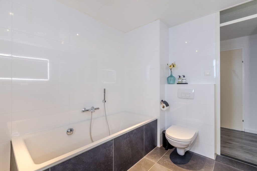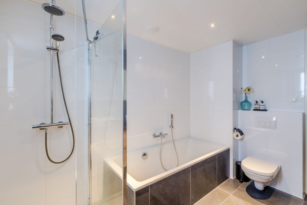 Op deze verdieping vind je een royale badkamer met inloopdouche, plaatstalen badkuip, dubbele wastafel en toilet. Extra luxe: ingebouwde plafondspeakers.