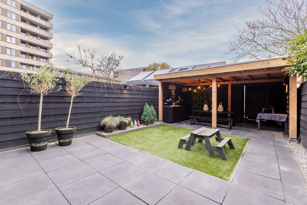 - Zonnige tuin op het westen met overkapping, schuur en achterom (afsluitbare poort)