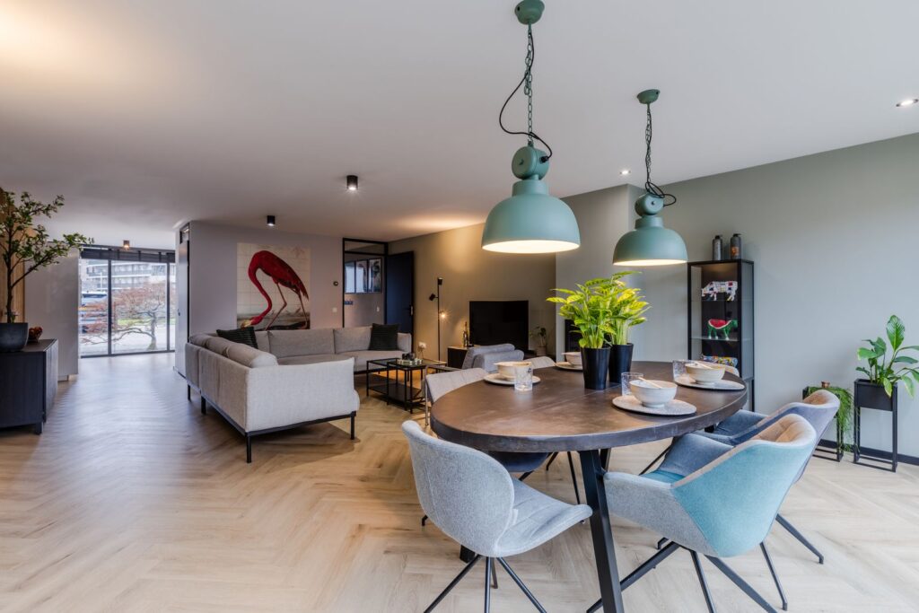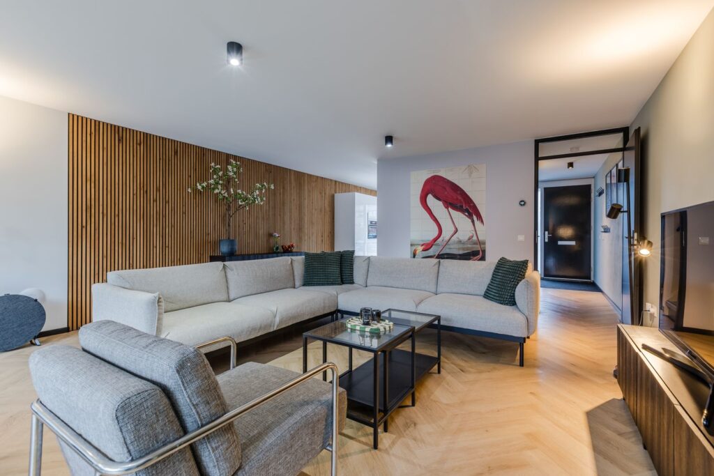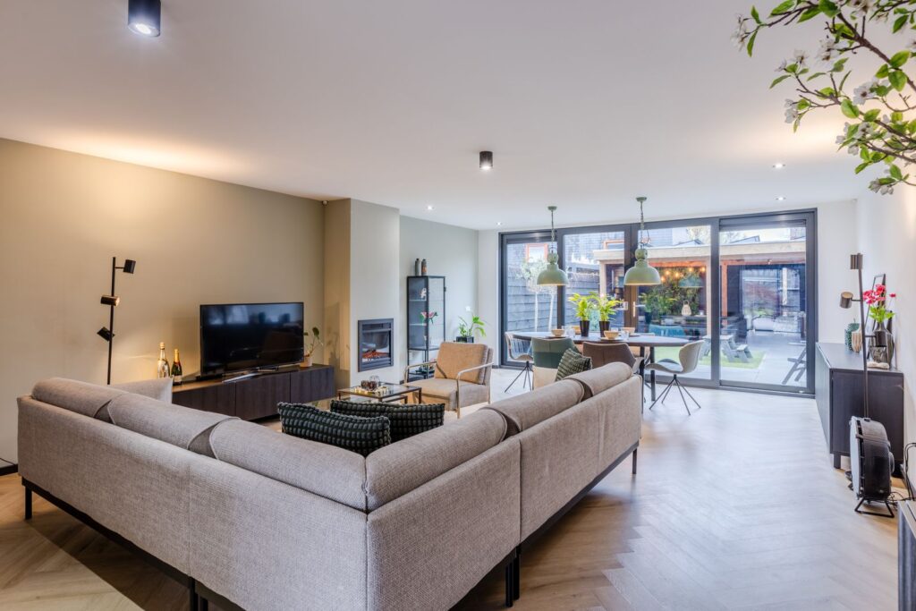 De ruime woonkamer (met visgraat PVC-vloer) is dankzij de uitbouw heerlijk royaal en comfortabel door de vloerverwarming (stadsverwarming). Via de grote aluminium schuifpui met triple glas loop je zo de tuin in. Op zonnige dagen zorgt het elektrische screen voor extra comfort. De uitbouw is afgewerkt met een sedumdak en voorzien van 2 zonnepanelen.