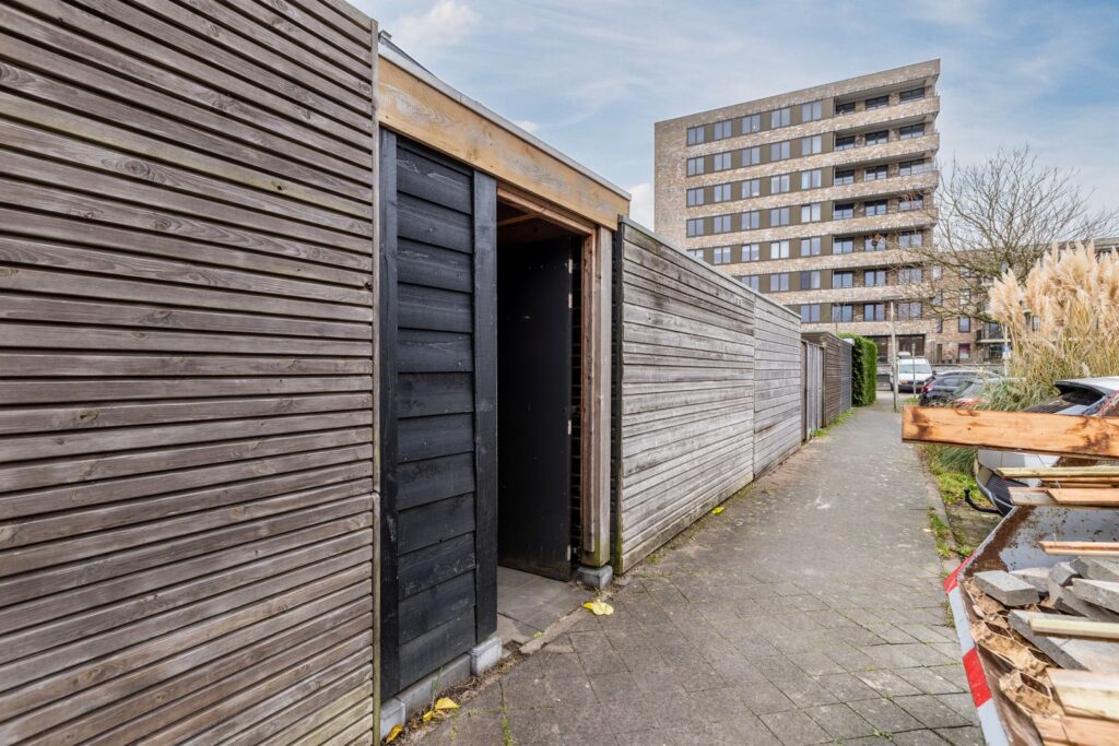 De onderhoudsarme tuin ligt ideaal op het westen: zon in de middag en avond. Met de overkapping is dit een heerlijke plek voor lange zomeravonden. Daarnaast is er een ruime schuur en een achterom met afgesloten poort.