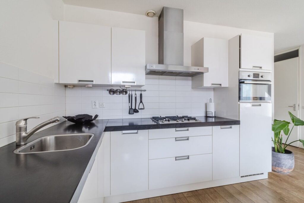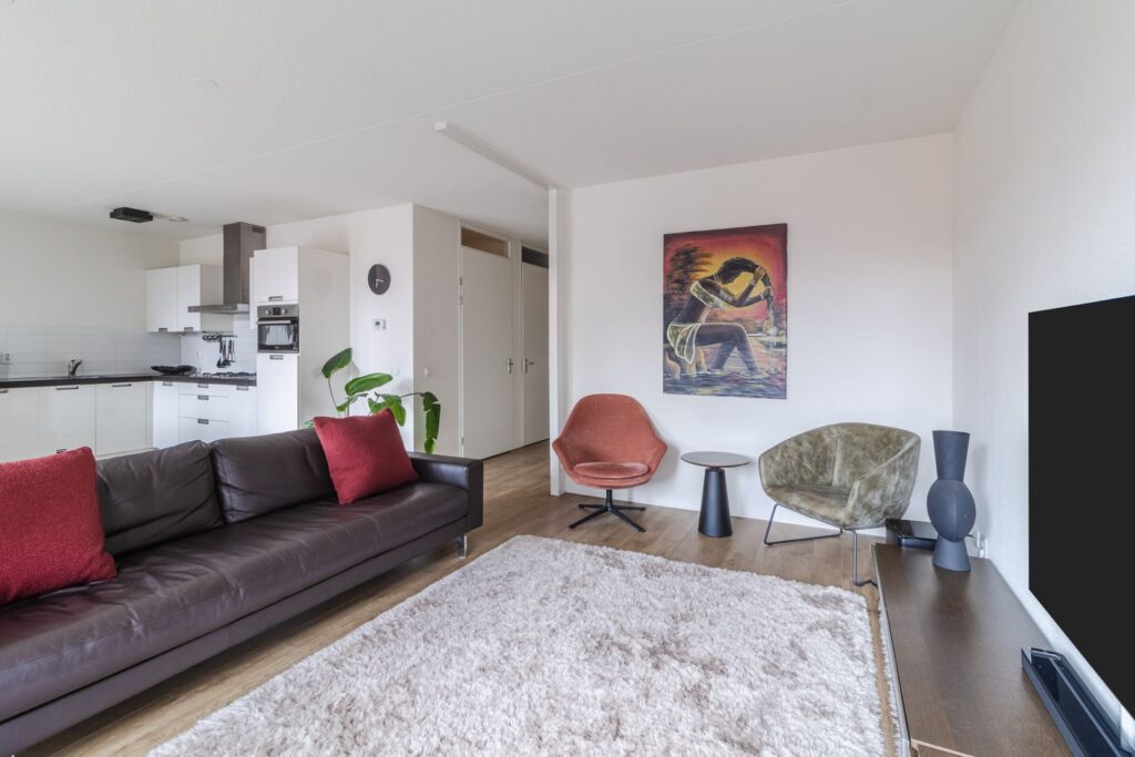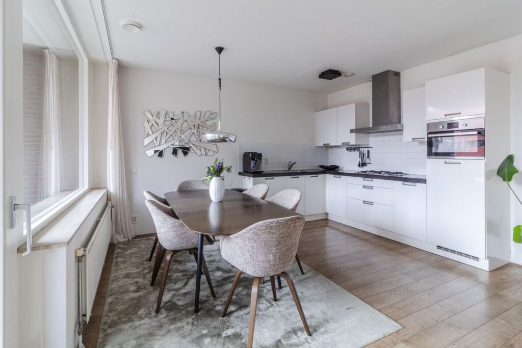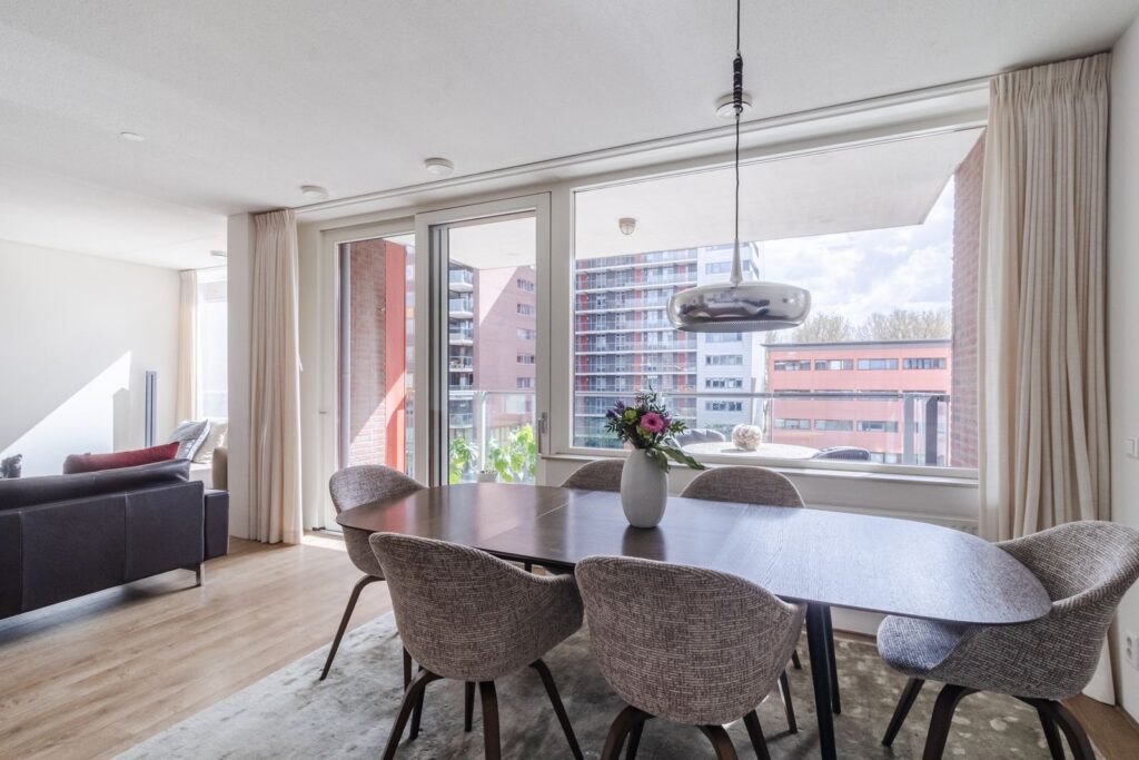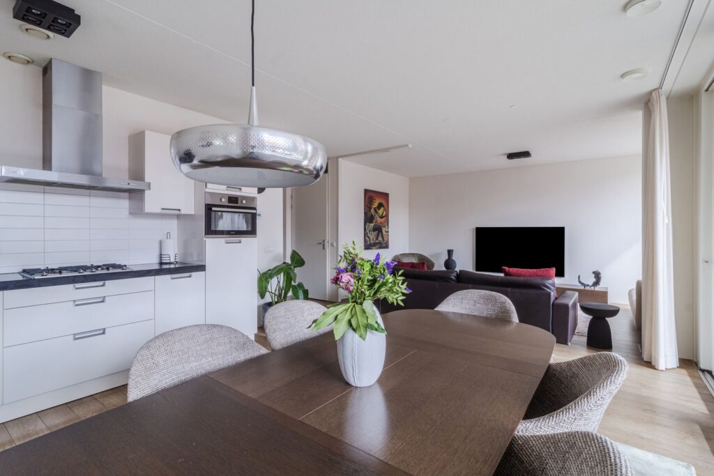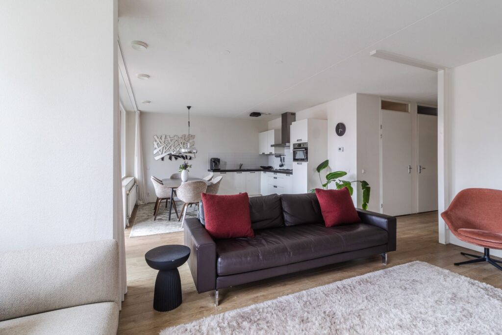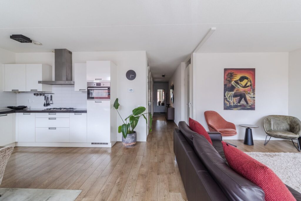 Binnenkomst in de lang uitgestrekte entree welke doorloopt tot het leefgedeelte, dat is gesitueerd aan de achterzijde. Hier creëren de grote raampartijen over de gehele breedte en hoge plafonds (ca. 2,64m hoog) een fijne lichte ruimte. Daarnaast heeft de living een keurige afwerking en is voorzien van een mooie laminaatvloer. De moderne open keuken met kookeiland zorgt ervoor dat koken, dineren en lekker lang natafelen perfect samen gaan! De keuken beschikt over een 4-pits gasfornuis, afzuigkap, koel- en vriescombinatie, combioven, vaatwasser en voldoende opbergruimte. Via de schuifpui kom je op het zonnige balkon terecht, gelegen op het zuiden. Een heerlijke plek om van het zonnetje te genieten met mooi weer. Zie jij jezelf hier al zitten?
