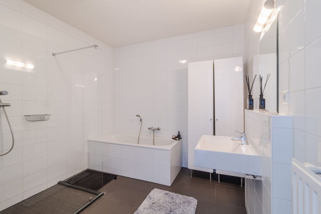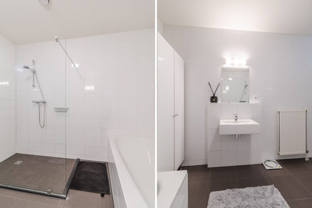 Terug in de woning bevinden zich aan de galerijzijde twee slaapkamers (ca.8m2 en 14m2), die beide zijn voorzien van een fijne lichtinval. De nette, ruime badkamer is volledig betegeld en uitgerust met een inloopdouche, ligbad en een wastafel.