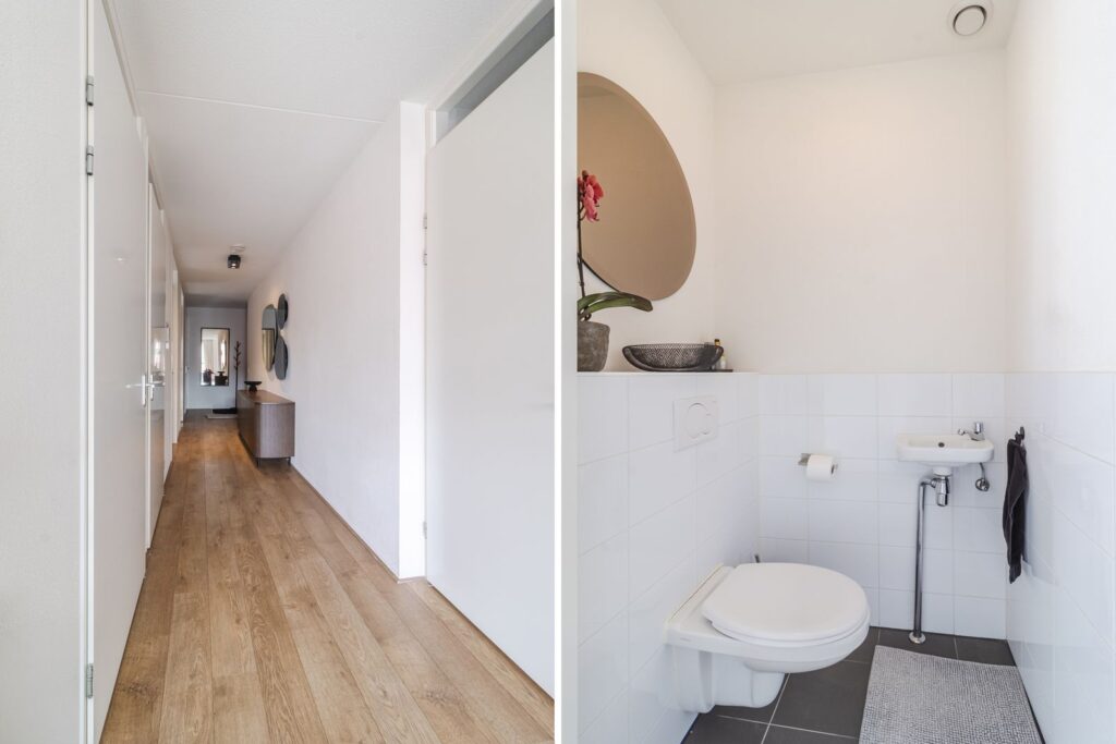 In de hal tref je de meterkast, een ruime inpandige berging/bijkeuken met aansluitingen voor de wasmachine en droger, de opstelling van de C.V.-combiketel (Valliant EcoFit Pro 2021) en de WTW-installatie, evenals een separaat toilet met zwevend closet en fonteintje.